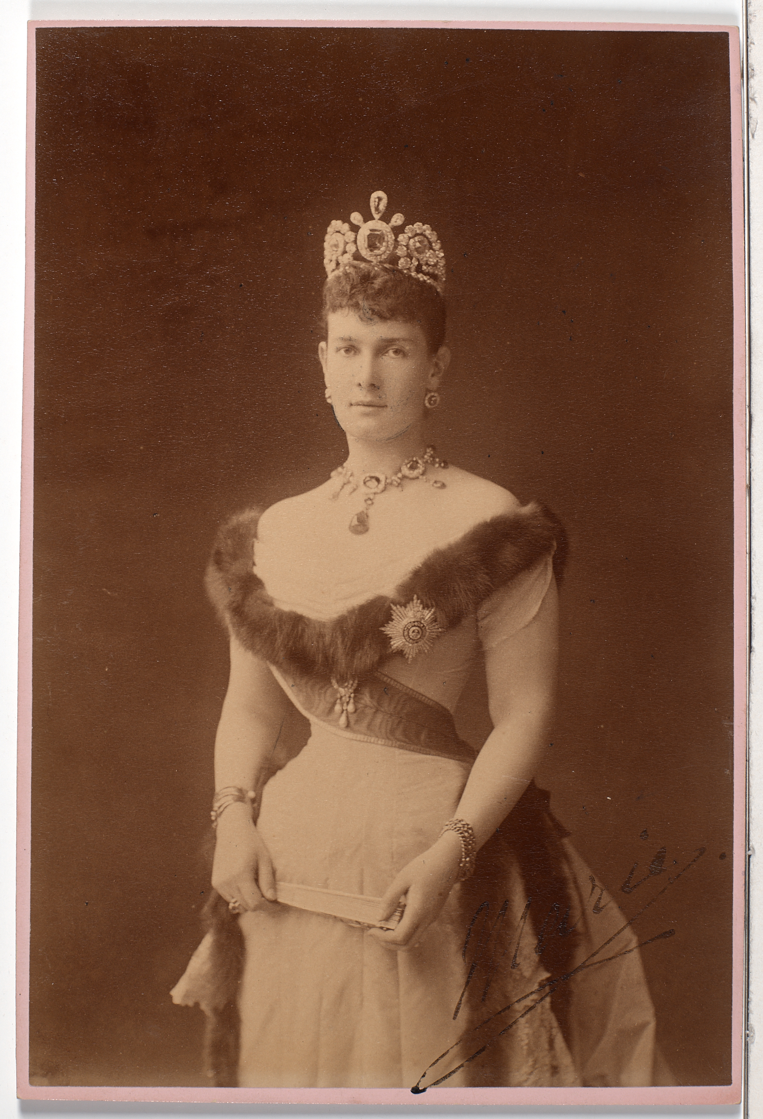 The rectangular photograph depicts a young woman shown down to her knees. Both her arms are lowered down. She holds a fan in her hands. Her hair is pinned up at the back of her head with a fringe styled on the forehead. On the head, she is wearing a richly decorated diamond diadem. In her ears, there are diamond earrings. The woman is wearing in a light-coloured long dress decorated with dark fur at the neckline. Her neck is surrounded by a necklace of precious stones. Both her wrists feature bracelets. A wide ribbon runs over the woman's right shoulder. At her left breast, there is a star order. The bottom right corner has a black-ink inscription: “Marie”. The reverse is covered with cardboard. The reverse centre has an attached support for placing the photograph upright. It was acquired from the collection of the Potocki family of Łańcut in 1944.