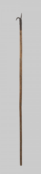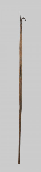 Fishermen used gaffs as auxiliary tools for pulling seine lines out of the water, spreading the lines on which set nets were mounted, or for pulling and pushing boats. During winter fishing, gaffs were used to push poles by gripping them from below. In the past, gaffs served various purposes and were used in many trades. They were used to catch wood when it drifted away from raftsmen, and during ice transport, they were used to grip and push ice blocks. Poachers also used gaffs as spears, which led to a regulation from an inspection in 1767 in the Puck district that stated, "No one should dare to go fishing with a gaff or catch eels with it under penalty...". Today, gaffs are most commonly used by sailors and firefighters – for mooring, retrieving lines and other equipment from the water, even rescuing drowning people, and for demolition or breaking apart burning elements during fires. The Pomeranian Ethnography Department of the National Museum in Szczecin has 17 gaffs, but only 2 have retained their long shafts. The fisherman's gaff here was used in the first half of the 20th century in Szczecin's Skolwin district, which is located on the Oder River and, through the Iński Nurt and Babina water channels, also has access to Lake Dąbie. It was purchased for the museum's collection shortly after World War II, in 1949. Małgorzata Kłosińska-Grzechowiak