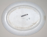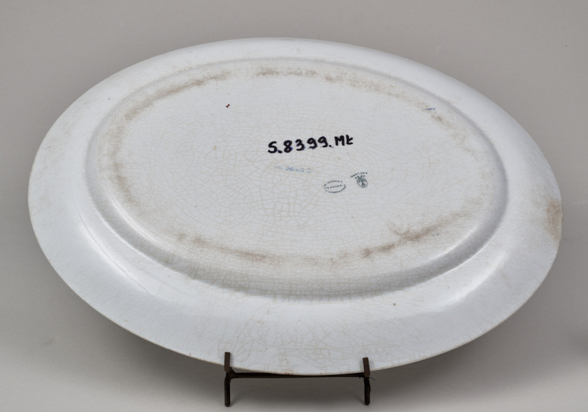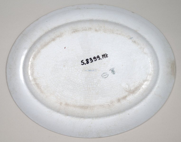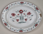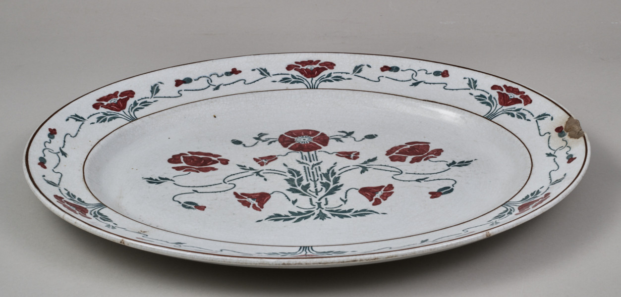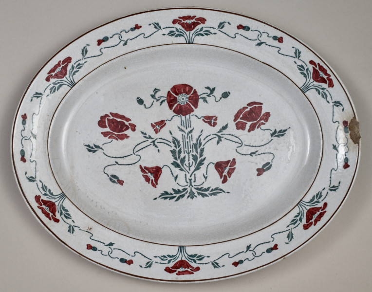 An oval platter with a wide lip, featuring an Art Nouveau painted decoration with a motif of stylised poppies. The leaves, stems, and flower outlines are dark green and applied using a stencil, while the flower petals are hand-painted with a burgundy-red paint. The oval well is adorned with a stylised bouquet of poppies. The central flower, viewed from above, along with its stem, forms the axis of the composition, symmetrically flanked by the remaining flowers and buds on thin, S-curved stems with leaves. At the base of the bouquet, three leaves complete the design: two long leaves extending outward and a small one on the axis. The platter's lip is bordered by two brown stripes—an outer, wider stripe and an inner, narrower one—between which runs a continuous, repeating ornament, composed of fully open, cup-shaped flowers and blooming buds intertwined with long, curved stems. On the underside of the platter, there is the manufacturer’s signature: an anchor within an oval with the inscription S. B. and S/ENGLAND underneath, and next to it, the signature of the store: SOUTH AUDLEY ST. /T GOODE&Co/ LONDON.W., BRIDGWOOD? 4-20.