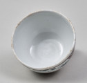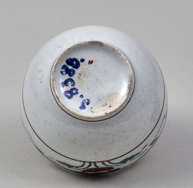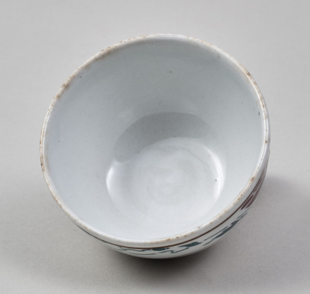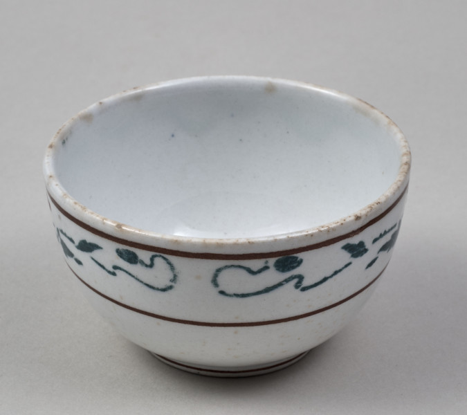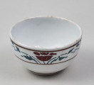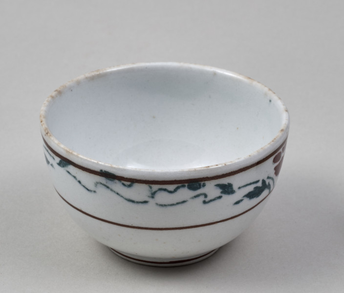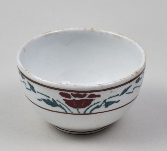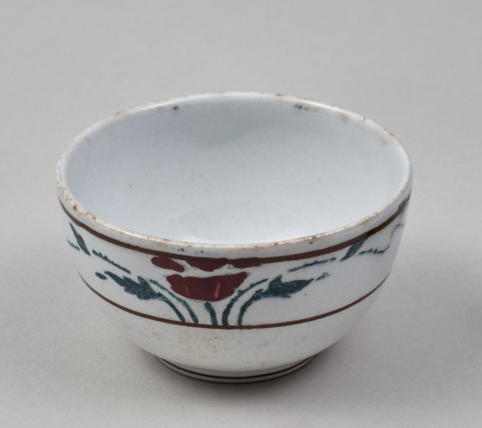 Cup – small, faience, hemispherical with a slightly defined foot, modestly decorated with a two-tone strip of stylised poppies (burgundy-red flower petals, dark green leaves, stems, and poppy heads) running around the rim, enclosed between two brown stripes. The decoration consists of a twice-repeated pattern, i.e. a symmetrical pattern within the perimeter of the rim of the cup with the motif of a cup-shaped poppy standing between a pair of long, S-shaped twisted stems ending in poppy heads. The foot, like the decoration strip, is bordered with a brown stripe. On the underside of the bottom, there is a hand-painted painter's mark in burgundy resembling the letter "H". On the surface of the cup, there are factory impurities in the form of yellow dots, concentrating around the edge of the rim.