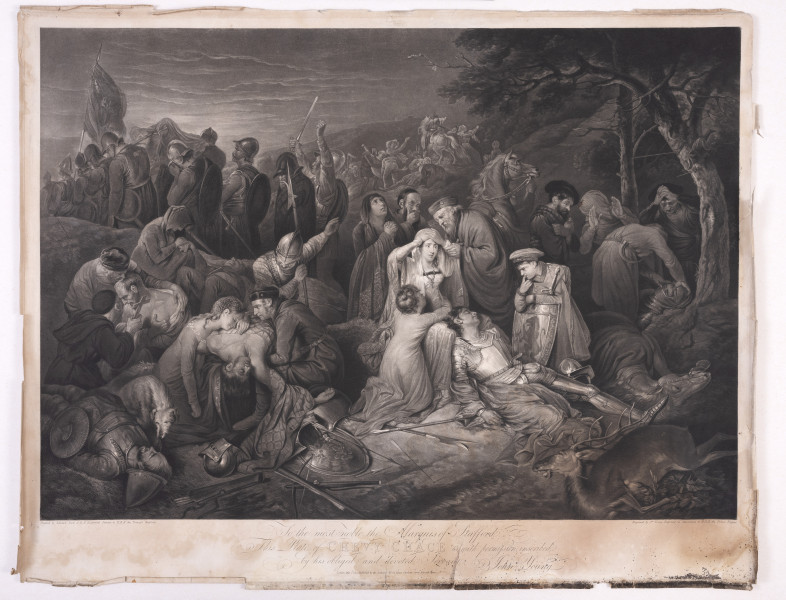 The composition depicts the aftermath of the Battle of Otterburn, fought in the hunting grounds known as Chevy Chase in the Cheviot Hills along the English-Scottish border. On the 5th or 19th of August 1388, English forces led by Sir Henry Percy (1364–1403), known as Hotspur, clashed with Scottish forces under Sir James Douglas, 2nd Earl of Douglas (c. 1358–1388). The commanders of both armies are shown in the foreground as fallen, mourned by surrounding secular and religious figures. In reality, Sir Henry Percy was merely captured at Otterburn and later ransomed. The battle is recounted in the English ballad The Ballad of Chevy Chase, known from various oral traditions. The dedication below the depiction was addressed to George Leveson-Gower, 1st Duke of Sutherland (1758–1833) – a politician, British ambassador to Paris, entrepreneur, and patron of the arts, regarded in his time as the richest man in England. Through family connections and his marriage, he acquired extensive lands and benefited from industrial and technical enterprises. On his estates, he extracted numerous raw materials while investing in the development of river and railway transport routes essential for their trade. In 1806, he was honoured with the Order of the Garter. In 1812, he retired from politics to focus on his business ventures and promotion of the arts. He became a trustee of the British Museum and chairman of the British Institution (1805–1867). The engraving was created after an oil painting from 1810–1812 by Edward Bird (1772–1819), a central figure of the Bristol School art group, a member of the Royal Academy, and an artist active at the British royal court, including for Princess Charlotte (1796–1817), daughter of the Prince Regent George IV (1762–1830). The painting The Battle of Chevy Chase, originally part of George Leveson-Gower's collection, is now housed in Wolverhampton Art Gallery. The creator of the engraving, John Young (1755–1825, London), was an English draughtsman, engraver, illustrator, publisher, and printer. Ewa Gwiazdowska