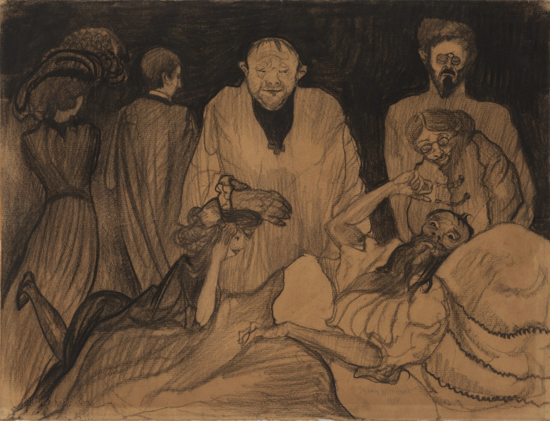 The deathbed scene, featuring a gaunt bearded man, an old woman, a doctor, a priest, and a departing couple, simultaneously portrays the erotic temptation of the dying man by a young woman. The ambiguity of the scene is heightened by an almost landscape-like study of the draped fabric, shaped through a trembling, undulating contour and strong hatching, reminiscent of the geological-cosmic fantasies of some German and Austrian Expressionists. Initially, these artists welcomed the outbreak of war as the advent of long-awaited political and social changes. Witkacy also sought to contribute to these transformations; however, contrary to his father’s pro-Austrian views, he aligned himself with the Russian side.