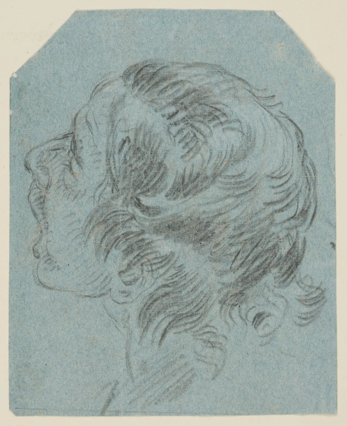 Giambattista Tiepolo's drawing shows a young man's head facing left in a rather complicated view - backwards from below. The young man is raising his head, wrinkling his eyebrows and opening his mouth wide to scream. The face can be seen in a large foreshortened perspective. The bulk of the sketch shows short, dark locks cascading over each other. A few twisted curls fall to the nape. So far, no equivalent of this drawing has been found in any of Giambattista's work. However, according to George Knox, an English researcher on Tiepolos' oeuvre, the stylistic features of the sketch - the perspective, chiaroscuro and the way of working with crayons using short, strong lines, densely overlapping each other and artistically modelling the figure - prove the authorship of this particular artist. The drawing was made with black and white crayons on thin, blue Venetian paper with the watermark of a paper-maker(?) - a bird and the letters RO SA. It is part of the collection of drawings that came to Szczecin at the end of the 19th century. In 1907, they were transferred to the collection of the Cabinet of Graphic Arts of the then-emerging City Museum (Muzeum Miejskie). After the war, they were briefly located in the Soviet Union, then as a deposit in the National Museum (Muzeum Narodowe) in Warsaw. Today, they are in the Cabinet of Graphic Arts of the National Museum in Szczecin.