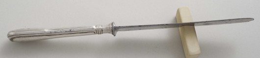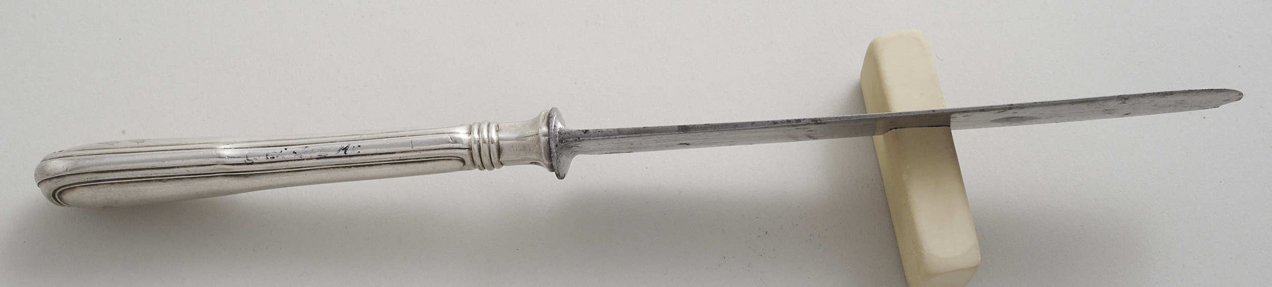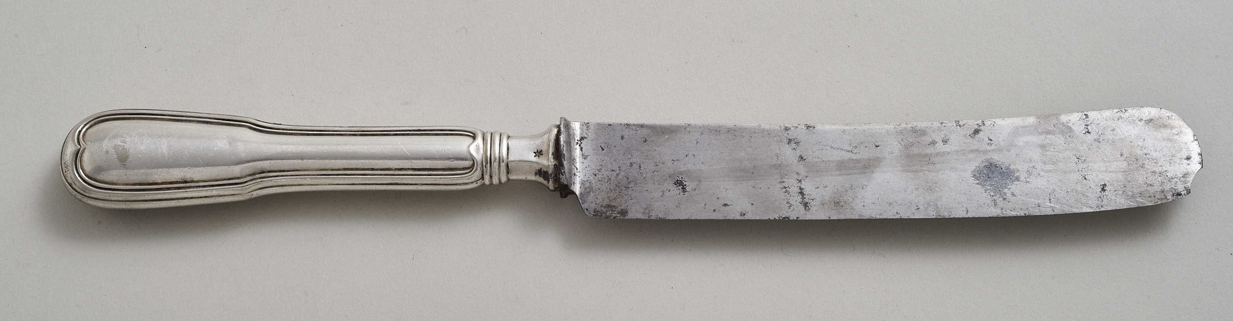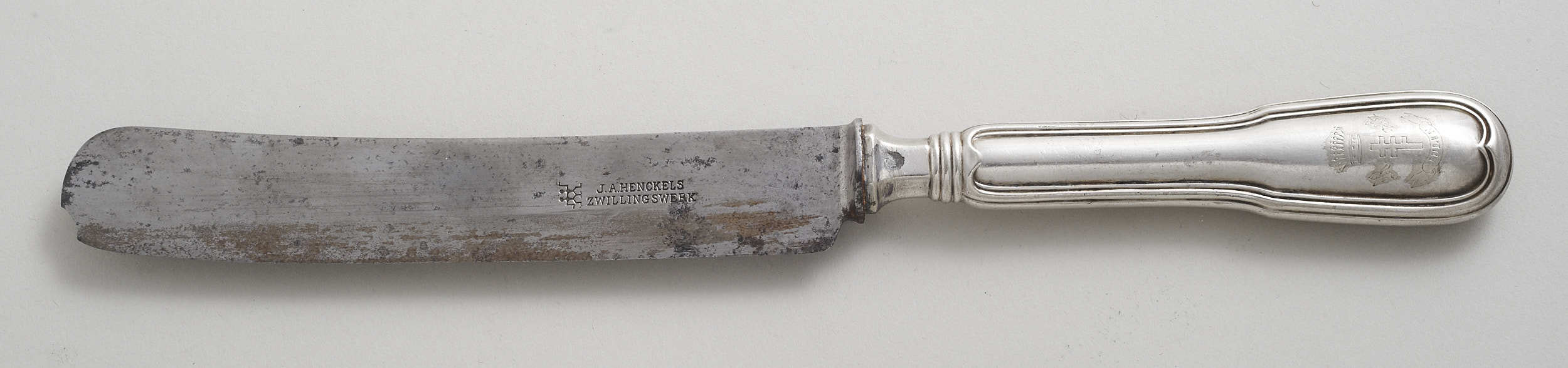 A table knife. A plated handle with flared end decorated with double profiling. One side of the handle shows a count's crown with the Potocki family's coat of arms, i.e. Pilawa, below it. On the sides, there are symmetrically arranged letters R and P with a visible sash with the inscription “Julin” under the coat of arms . In addition, a punch is stamped on the handle necking. The knife was manufactured by J.A. Henckels Zwillingswerk, with their logo and name found on the blade.
