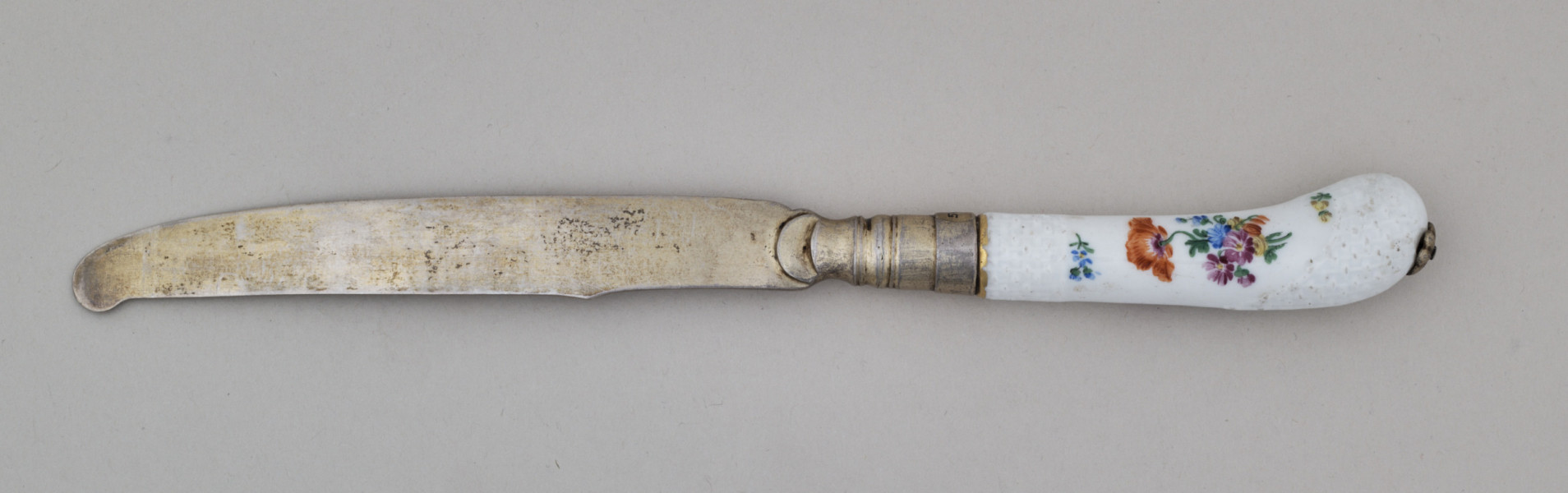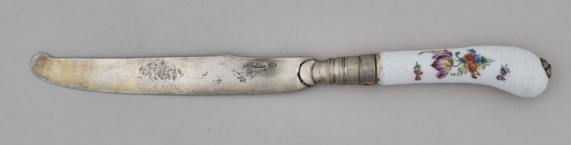 Dinner knife with a flat blade, rounded at the end. On the other side, the blade is fitted with a ferrule and connected to a porcelain handle The handle, curved in the shape of a stylised "S," is made of white porcelain and features three-dimensional artistic decoration at both ends in the form of a chequered pattern. It is hand-painted on both sides with multicoloured flowers. On the obverse, there is an orange-burgundy poppy, burgundy wild roses, blue chicory, and a sprig of forget-me-nots. On the reverse, there is a burgundy-yellow tulip, orange Chinese lantern (physalis), and blue delphinium. The end of the handle is adorned with a gilded flower. The blade bears two marks: "Malcz" and "12," indicating the manufacturer and the silver fineness.