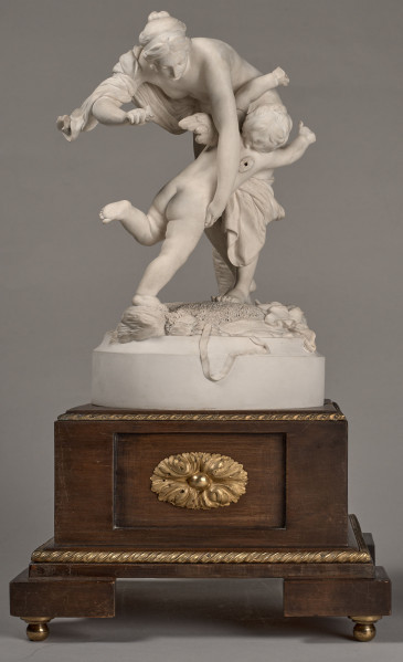 Venus chastising Cupid A bisque figural group depicting the half-naked goddess bending down to strike Cupid, who is wrenching himself out of her arms, with her right hand. Cupid is holding his hands up, his face contorted in pain. The stone floor is overgrown with moss. The bisque is placed in a rectangular display case with glass walls enclosed in bronze frames, with a wooden platform painted brown and decorated with classicist bronze ornaments. It was made in a factory in Lunéville (Lorraine), active from 1766 until 1780, according to François Boucher's design. The modeller was Paul-Louis Cyfflé. It is a non-porcelain bisque similar to faience, with a yellowish colour, the marble paste base whiter in colour. The factory in Lunéville made products from Lorraine clay with a yellowish colour, similar to delicate faience, known as terre de Lorraine, as well as from white pâte de marbre. (Wystawa biskwitów ze zbiorów Muzeum-Zamku w Łańcucie, Muzeum Narodowego w Warszawie z Oddziałem w Wilanowie, Muzeum Narodowego w Krakowie, Muzeum Narodowego w Poznaniu oraz osób prywatnych, Łańcut 1973, p. 11 - information on bisques from Łańcut by Irena Radomska.) Barbara Trojnar
