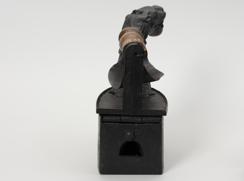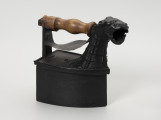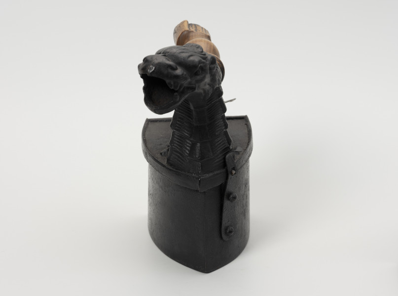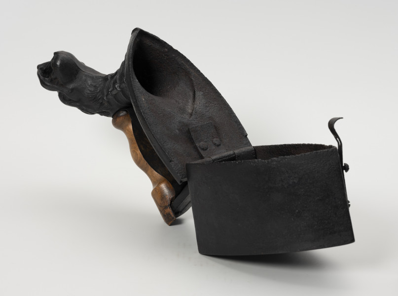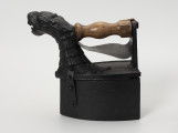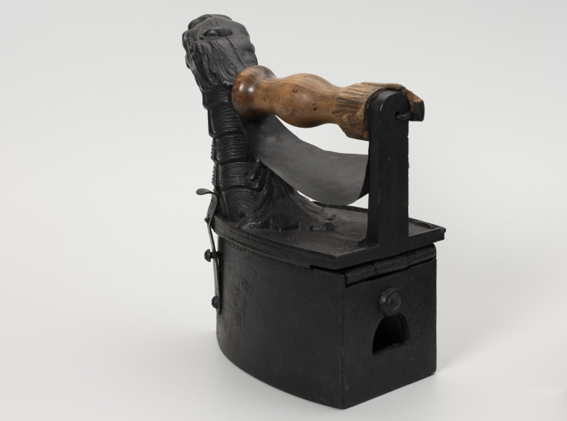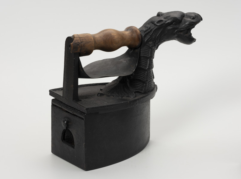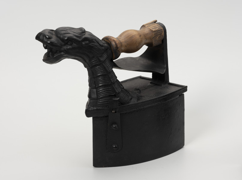 Irons are devices used for ironing, which means smoothing out wrinkles on fabric or leather through the application of heat and pressure. Before the invention of electric irons, one of the most commonly used types was the coal iron. These irons were heated to the required temperature by placing hot coals inside them. The drawback of this type of device was that ash from the iron could soil the fabric being ironed, and sparks could even burn it. Additionally, the person ironing was exposed to the harmful smoke produced by the burning coals. To address this, some coal irons had chimneys as an integral part, which directed the smoke away from the person ironing. In the ethnographic collections of the National Museum in Szczecin, there is a coal iron with a chimney shaped like a dragon's head. During ironing, the smoke would escape through the open mouth of the animal. The head is directed to the right, which suggests that the iron was intended for right-handed users. Such irons were also occasionally produced with the chimney facing the opposite direction – for left-handed users. At the back of the iron is a hole used to regulate the airflow into the device. The air supply increased when a flap (which has not survived) was opened. Increasing the airflow caused the coals to burn more intensely, raising the temperature of the iron. The handle is made of wood, and below it is a metal plate that protects the hand from the heat emitted by the iron. The size and weight of the iron indicate that it was used to press thick fabrics. Agnieszka Słowińska