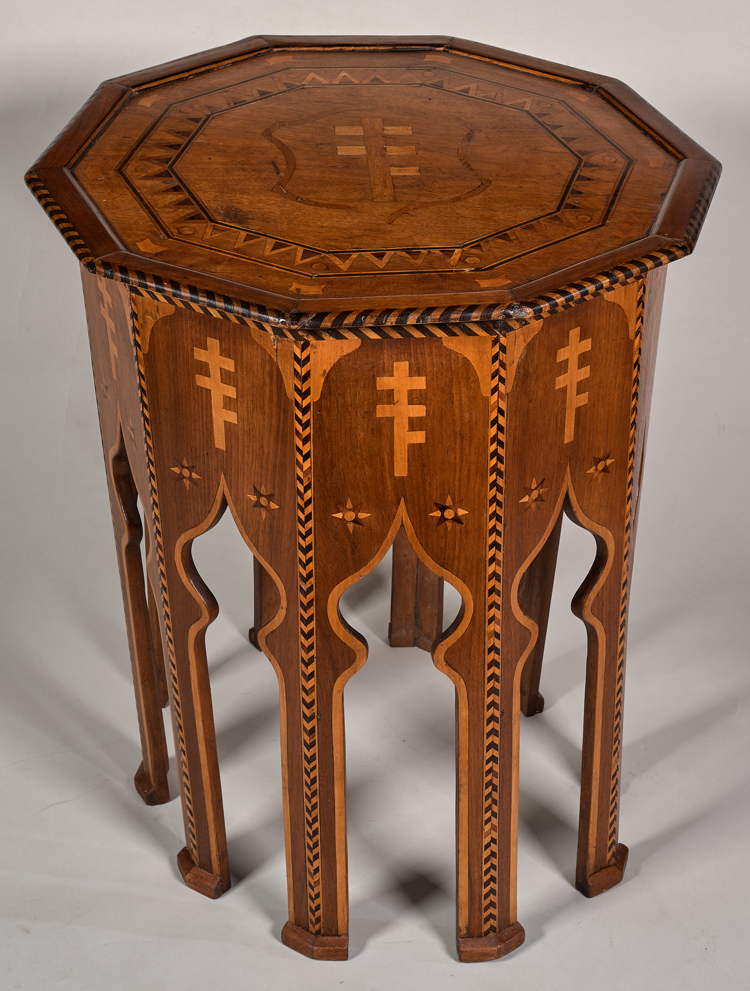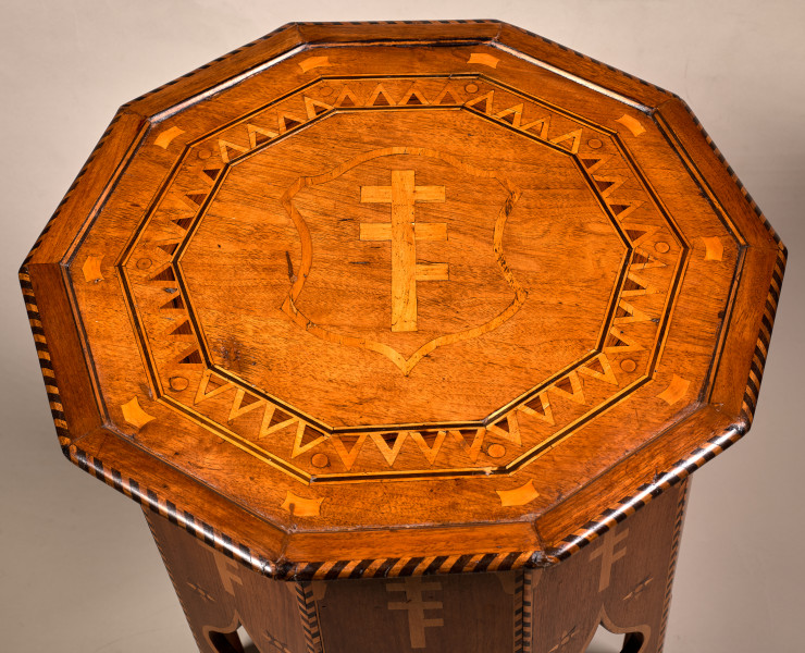 A table on ten legs. Inlaid inscription under the projection of the top: Nyasvizh. The table decorated with the Potocki family coat of arms (Pilawa). The table's legs are made of sycamore wood, the top is made of pine, and the rest is inlaid walnut, rosewood, sycamore and mahogany wood. The table was made in 19th century. The furniture was acquired from the Potockis in 1944.