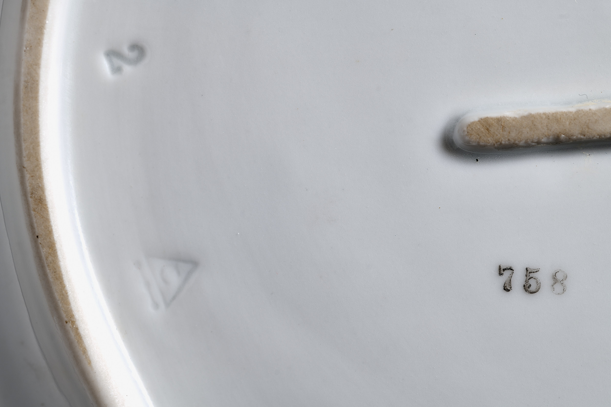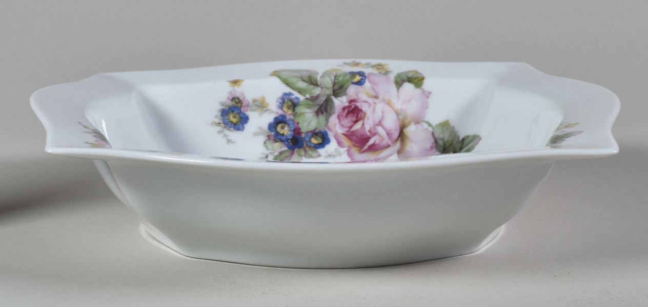 The platter has a quadrilateral shape. Its walls expand upwards and bulge slightly. The spout is slightly elevated. One side of the platter is decorated with a large bouquet of a pink rose, blue forget-me-nots and smaller gold flowers which covers the flat area, the wall and the spout. Two smaller bouquets are located in the corners on the opposite side. At the bottom underside, there are visible factory marks: C in triangle, 2 and a stamp 758.