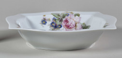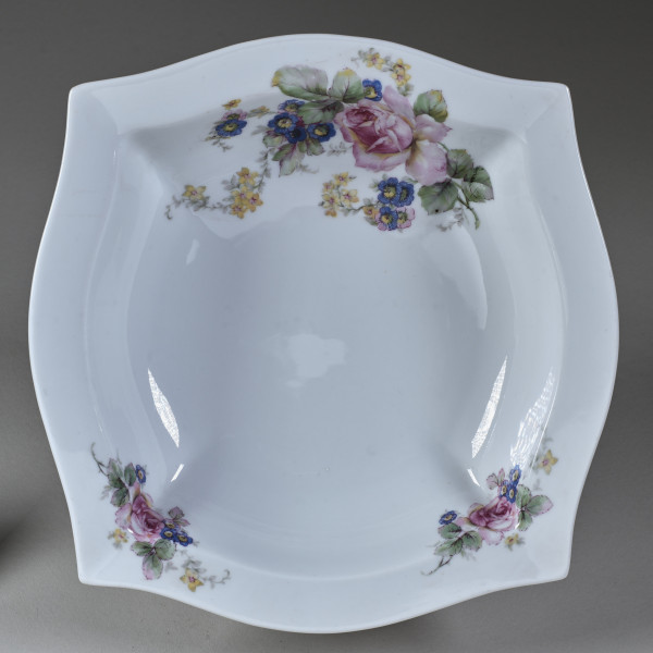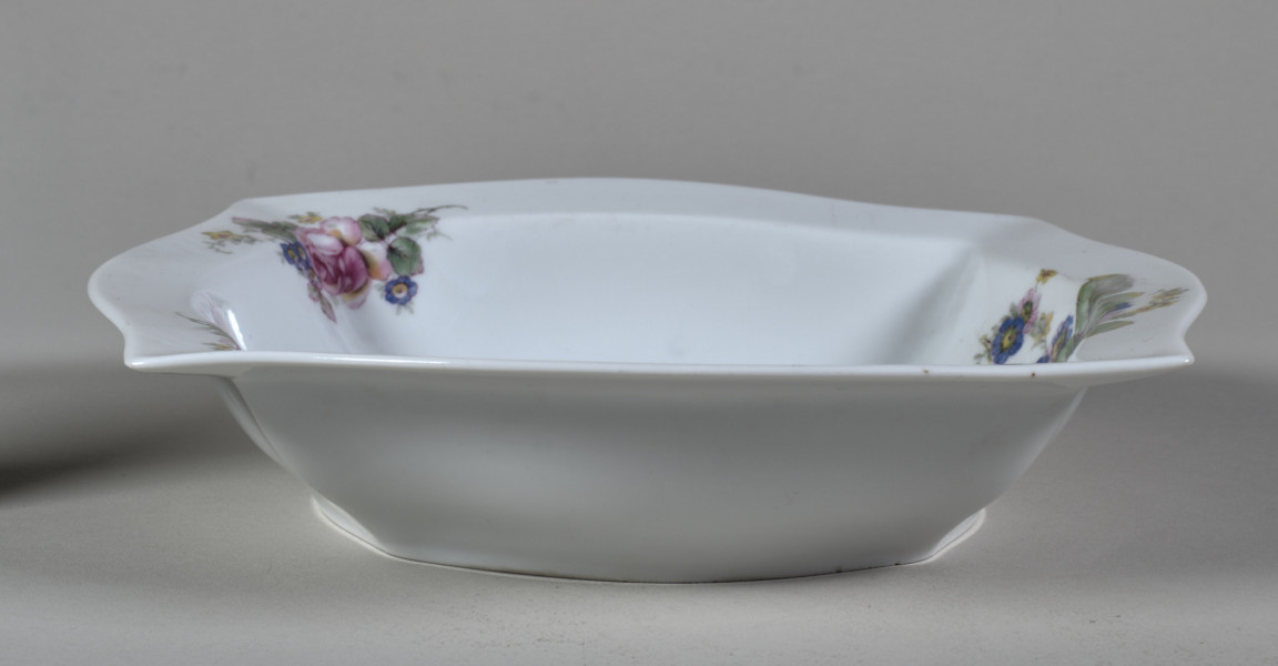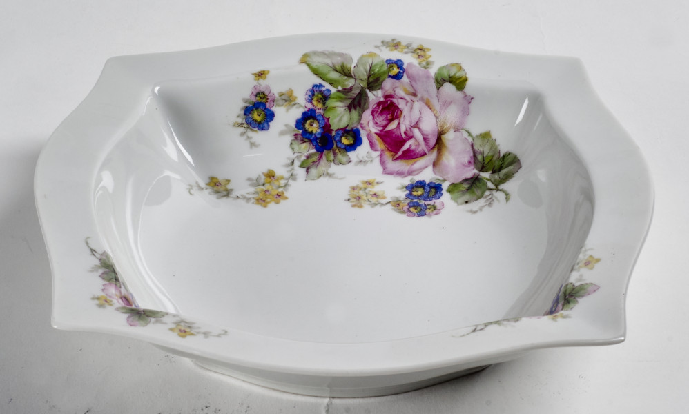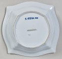 The quadrilateral platter is a part of a dinner set produced in the Porcelain Factory in Ćmielów. It was founded in 1790 and initially, as a small manufactory, produced earthenware and then faienceware. In 1838, it began producing porcelain and has continued doing that today.