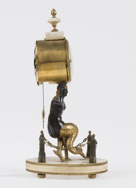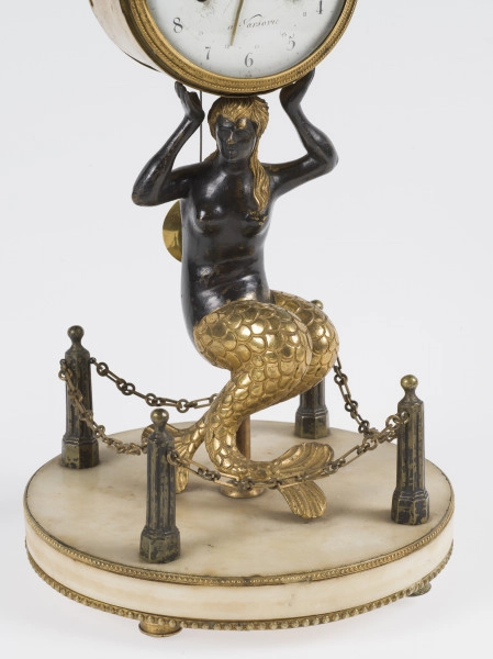 The case has a symbolic message. On a round marble base supported on four low legs, decorated with gilded beading, there is a central figure of a seated mermaid supporting in her raised hands a clockwork mechanism with a round dial. The whole is crowned with a decorative pinnacle. In Poland, especially in Warsaw, the figure of the Mermaid is commonly associated with the capital’s coat of arms. The change of the golden colour of the bronze figure’s body to black, as well as the surrounding chained pillars, is interpreted as a gesture demonstrating national mourning after the partitions of Poland.