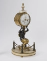 The clock is the work of the Warsaw clockmaker, whose ancestors came from Vienna and set up a workshop in Warsaw. For many years they provided the Potocki family with services connected with repairing clocks in the palaces of Warsaw and Wilanów. The mechanism by Michał Krantz, enclosed in a round case, has a separate spring drive for the clock and calendar, and a separate one for the Viennese-type hour and half-hour mechanism, from a single silver bell, as well as a hook and pinwheel regulator. It uses a light, long pendulum on a thread pendant. The round white enamelled dial of the mechanism with three brass hands marked the minutes, quarter hours, hours and days of the month. In 1788 M. Krantz made this type of minute clock showing calendar days as one of his masterpieces.