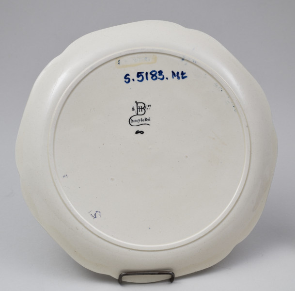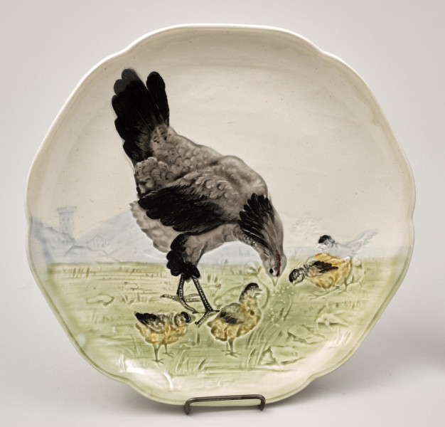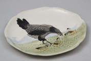 A faience shallow plate with a gently raised rim, shaped into six flat arches. The concave-convex relief decoration depicts a duck standing on a small promontory amidst a watery landscape. The decoration is executed in an underglaze technique using majolica paints in dark blue, green, light brown, grey-brown, and celadon green colours. The duck motif occupies a large part of the composition and is positioned in the centre. The bird is shown from the right profile. A frog leaps into the water from beneath the duck's feet. Clumps of aquatic grass rise above the horizon, with two larger, grey-coloured tufts standing out. In the concave relief layer, a colourless flock of birds is visible. The duck is painted in multiple colours: its head is dark blue, the neck dark green, the front of the chest brown, and the wing is tricoloured, filled with brown, blue, and green. The legs and beak are yellow-ochre. The sky is left in the creamy-yellow colour of the glaze.