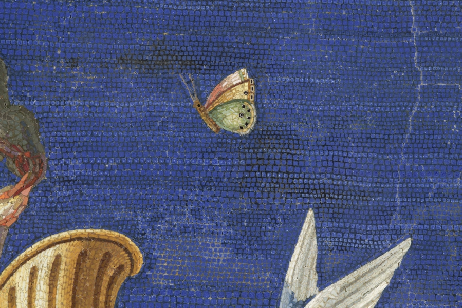 Amor’s Chariot was made using the micromosaic (mosaici in piccolo, mosaico minuto) technique. It was a method of “painting” based on the arrangement of small hard elements in various colours according to the planned composition. Their proper selection and assembly made it possible to reproduce the intended topic in a suggestive spatial manner. As the name suggests, micromosaics differed from the original technique – mosaic – in respect of a reduced scale of elements from which the picture, usually also of a small format, was built. The building material consisted of small, usually four-sided pieces of non-transparent glass (smalti filati) with a plastic structure arranged on a consolidating mass – putty. This technique was elaborated in the last quarter of the 18th century in Rome. At the end of the 18th century and in the first half of the 19th century, paintings made in this manner became one of the most popular objects purchased by Europeans from outside the Alps making their Italian Grand Tour.