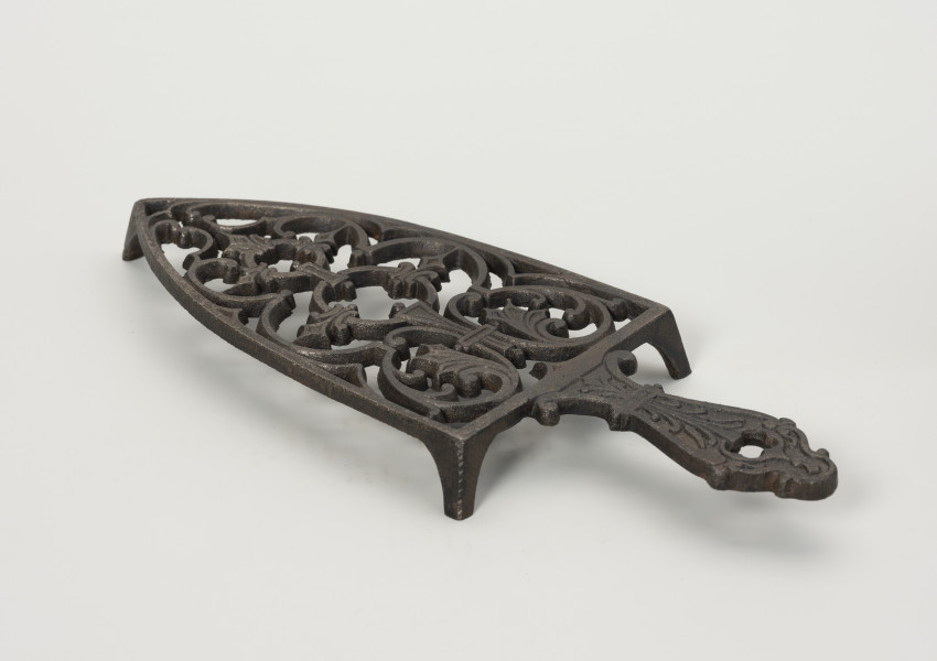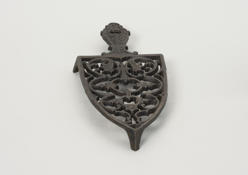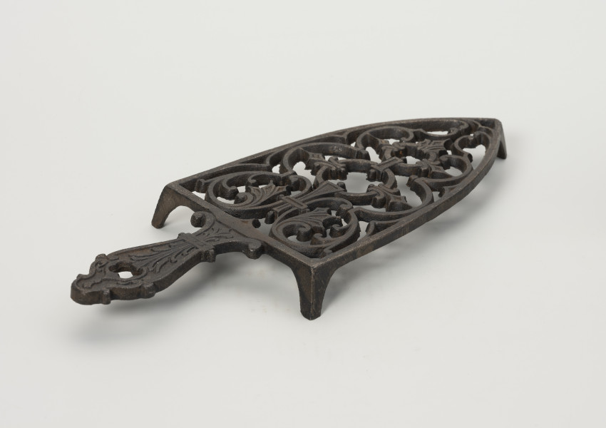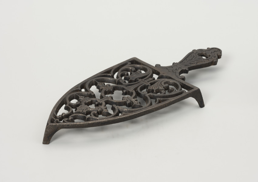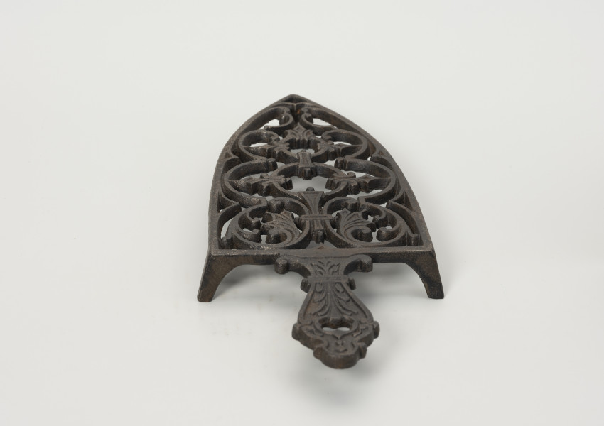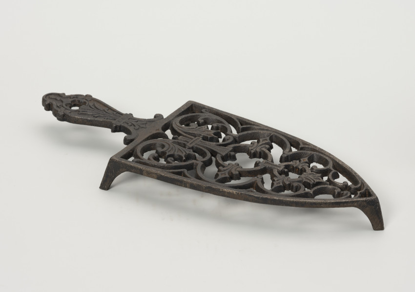 The first irons used for smoothing fabric creases date back to the 2nd century BCE in China. They took the form of deep pans made of bronze, which were filled with glowing charcoal to heat them to the proper temperature. Irons of this type were used not only in China but also in other regions of the Far East, continuously until the 19th and even the 20th century. The first irons made of wrought iron, resembling the shape of modern irons, date from the 14th to 15th centuries. In the past, metal stands were used to safely place the iron during breaks in ironing or after finishing, when the iron was still hot. Their shape was adapted to the soleplate of the iron, and they were mounted on short legs. They often had a handle, usually with a hole at the end for hanging the stand on the wall. Stands served not only a practical function but also a decorative one. Today, like the old irons, antique stands are often interesting interior design elements or collectible items. The ethnographic collection of the National Museum in Szczecin features an iron stand with an openwork floral-geometric pattern. It is a factory-made product, though the manufacturer is unknown. Stands of this type were commonly used. Agnieszka Słowińska