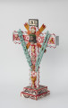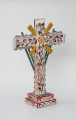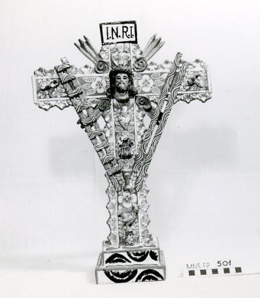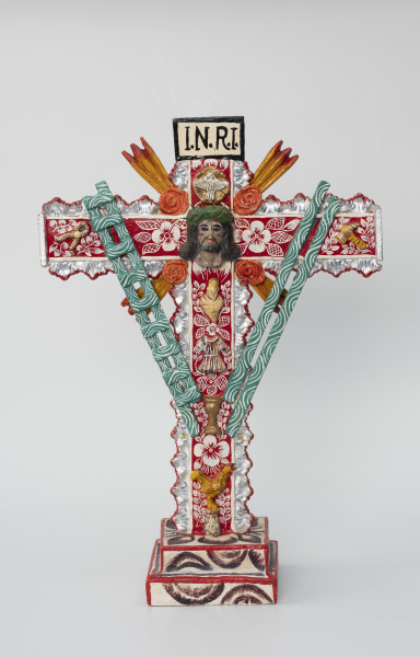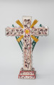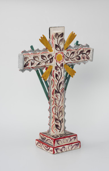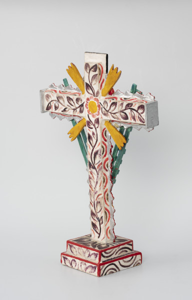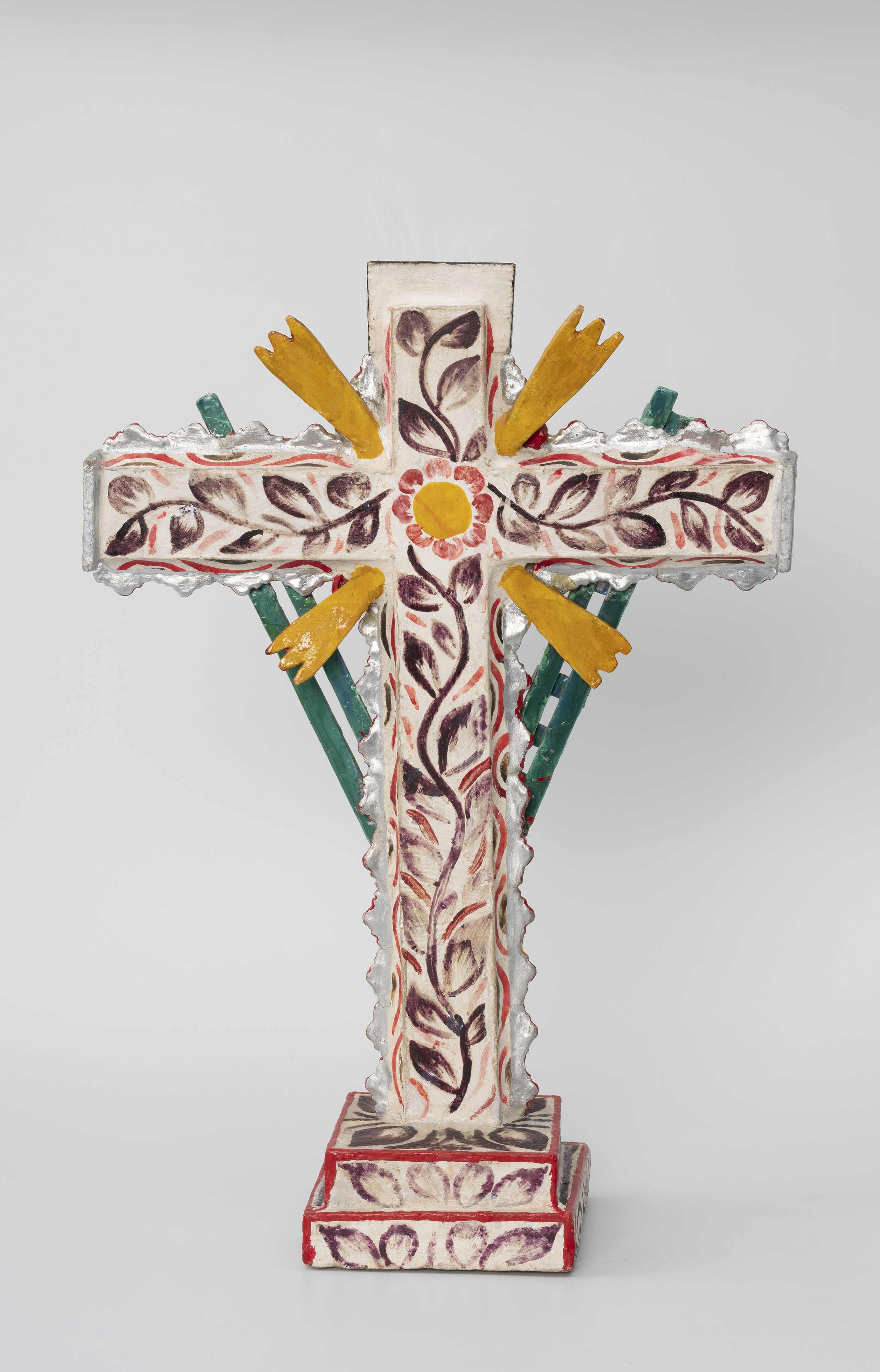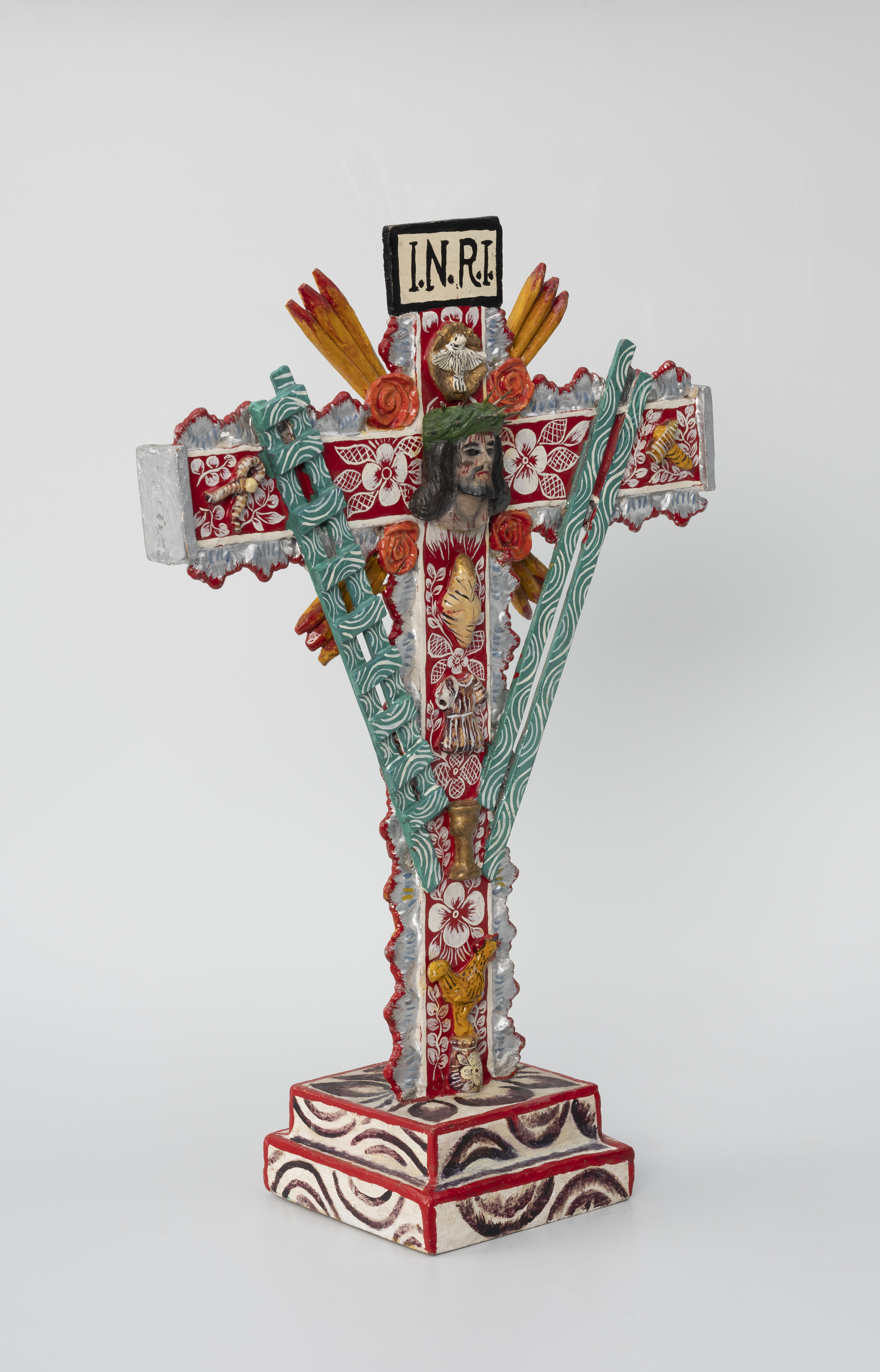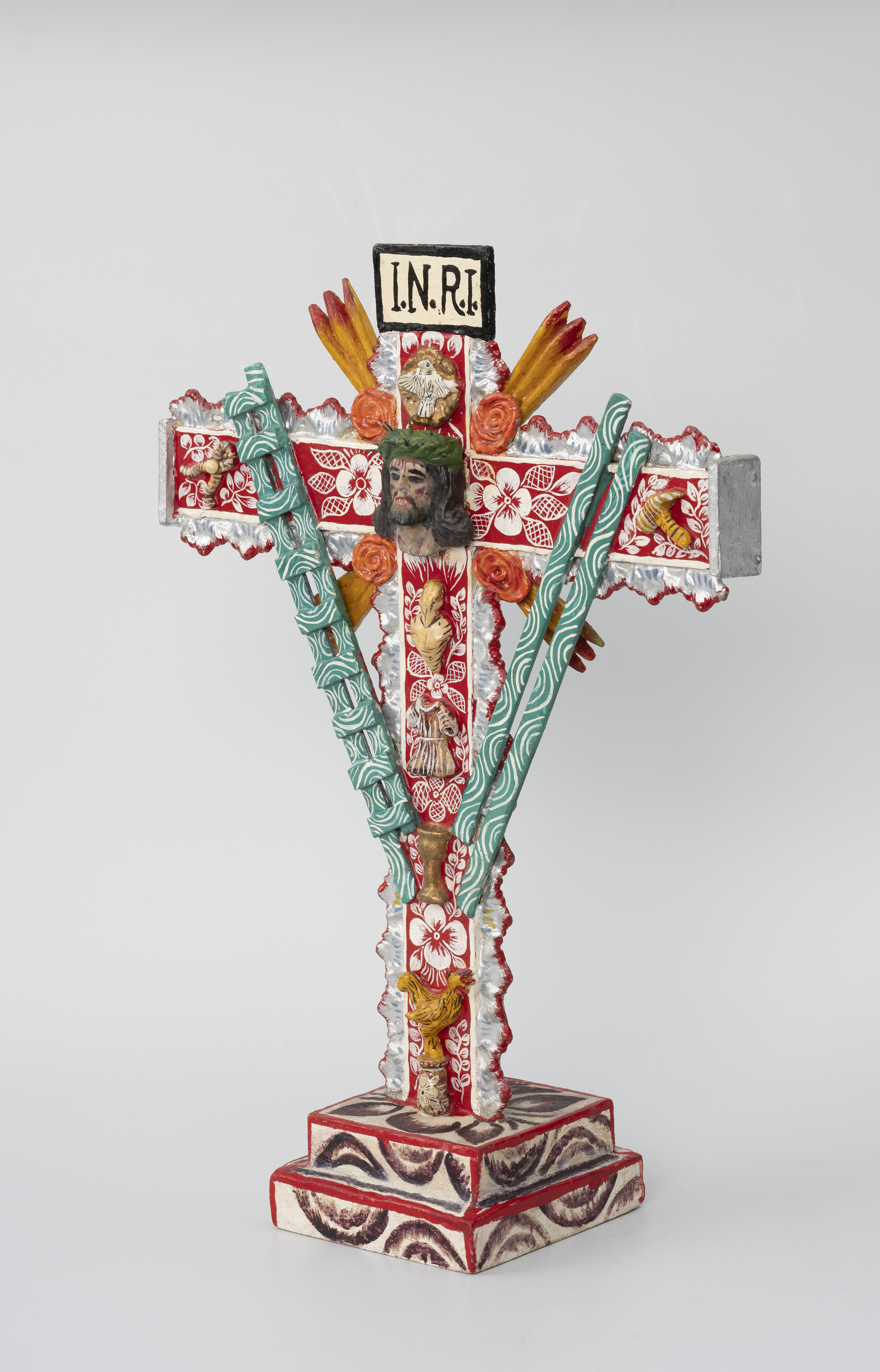 Originating in Quinua, an artisan centre in the Peruvian region of Ayacucho, the Passion Cross (Spanish cruz de la pasión) has, apart from the head of the suffering Christ in the crown of thorns placed in the central part, also numerous attributes and symbols of the Passion, such as: a heart, a tunic, a chalice, a rooster, a ladder, spears, pincers and a hammer. The colours used, wavy and floral design and the technique of execution, typical for these crosses, are similar to those used in the retablos boxes, which are a Peruvian national heritage. The cross-makers of the Ayacucho region are often also involved in the production of retablos and santolinos – small figurines depicting Catholic saints.