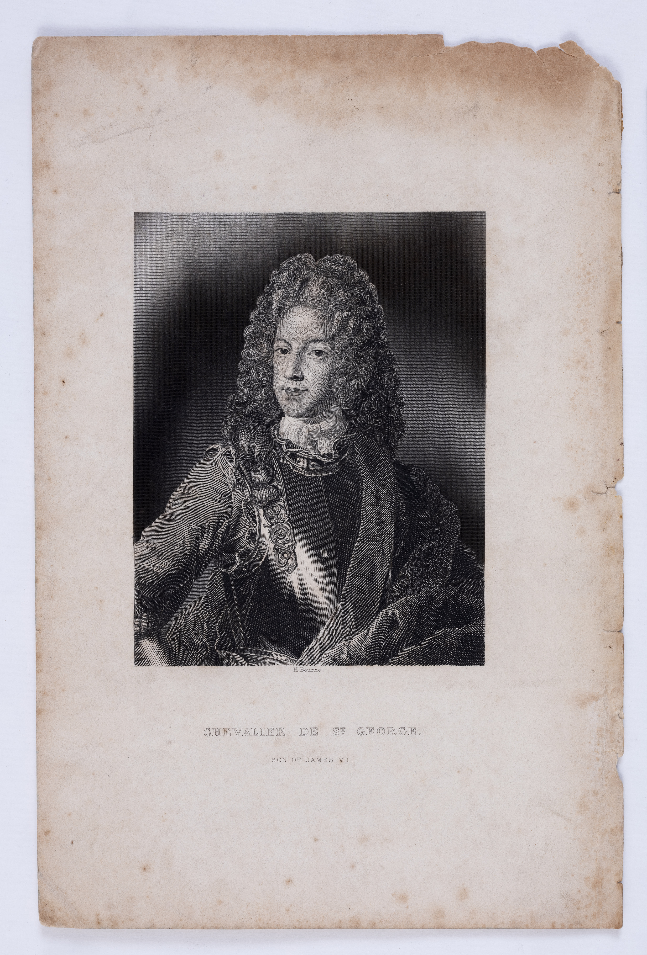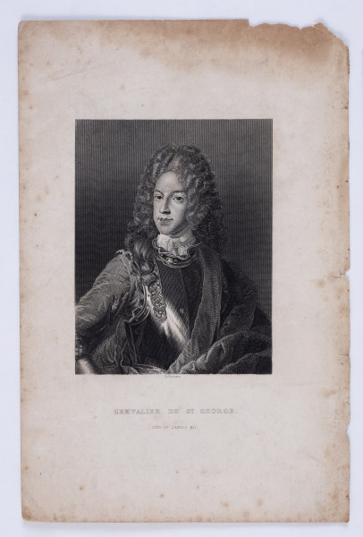 Chevalier de St. George, a contemplative young man in a alla longa wig, depicted half-length against a neutral, dark background, was the claimant to the British throne, James Francis Edward Stuart (1688–1766), the Prince of Wales. He is portrayed in a ceremonial outfit: a plate cuirass adorned with floral appliqué, worn over a doublet, with a cloak draped over his left shoulder. The wide sash of the Order of the Garter, dedicated to St. George, runs diagonally across his torso. James was the son of James II, King of England, Ireland, and Scotland (as James VII) (1633–1701), and Mary of Modena (1658–1718). He unsuccessfully sought to reclaim the throne after his father was deposed in 1688 due to his conversion to Catholicism. Backed by the Jacobite faction, James was a protégé of Louis XIV of France (1638–1715) and participated in the War of the Spanish Succession (1701–1714). He is said to have adopted the title Chevalier de St. George during the Battle of Malplaquet (1709), where he fought with the French court regiments. After Louis XIV's death and a failed attempt to reclaim the Scottish throne (1715–1716), James fell out of favour in France. Subsequently, his claims were supported by the Pope and the Spanish monarch. In 1719, he married Maria Clementina Sobieska (1702–1735), the granddaughter of the King of Poland. James lived in exile in France, Lorraine, papal Avignon, and later in Italy. Following the Jacobite uprising in Scotland in 1745, led by his son Charles Edward Stuart (1720–1788), James became known as the Old Pretender. The original portrait was painted by Alexis Simon Belle (1674–1734), a portraitist to the French court and, in particular, the Jacobites. Belle depicted James dressed in a red-sashed justaucorps and cuirass, with a landscape and drapery in the background. The engraving was created by Herbert Bourne (c. 1820–1907), an English reproductive engraver and illustrator active in London. Bourne exhibited at the Royal Academy from 1859 to 1885 and at the Royal Society of British Artists gallery on Suffolk Street (c. 1850–1885). From 1851, he also collaborated with The Art-Journal, engraving illustrations for the publication. Ewa Gwiazdowska