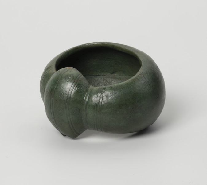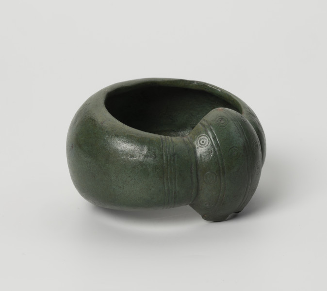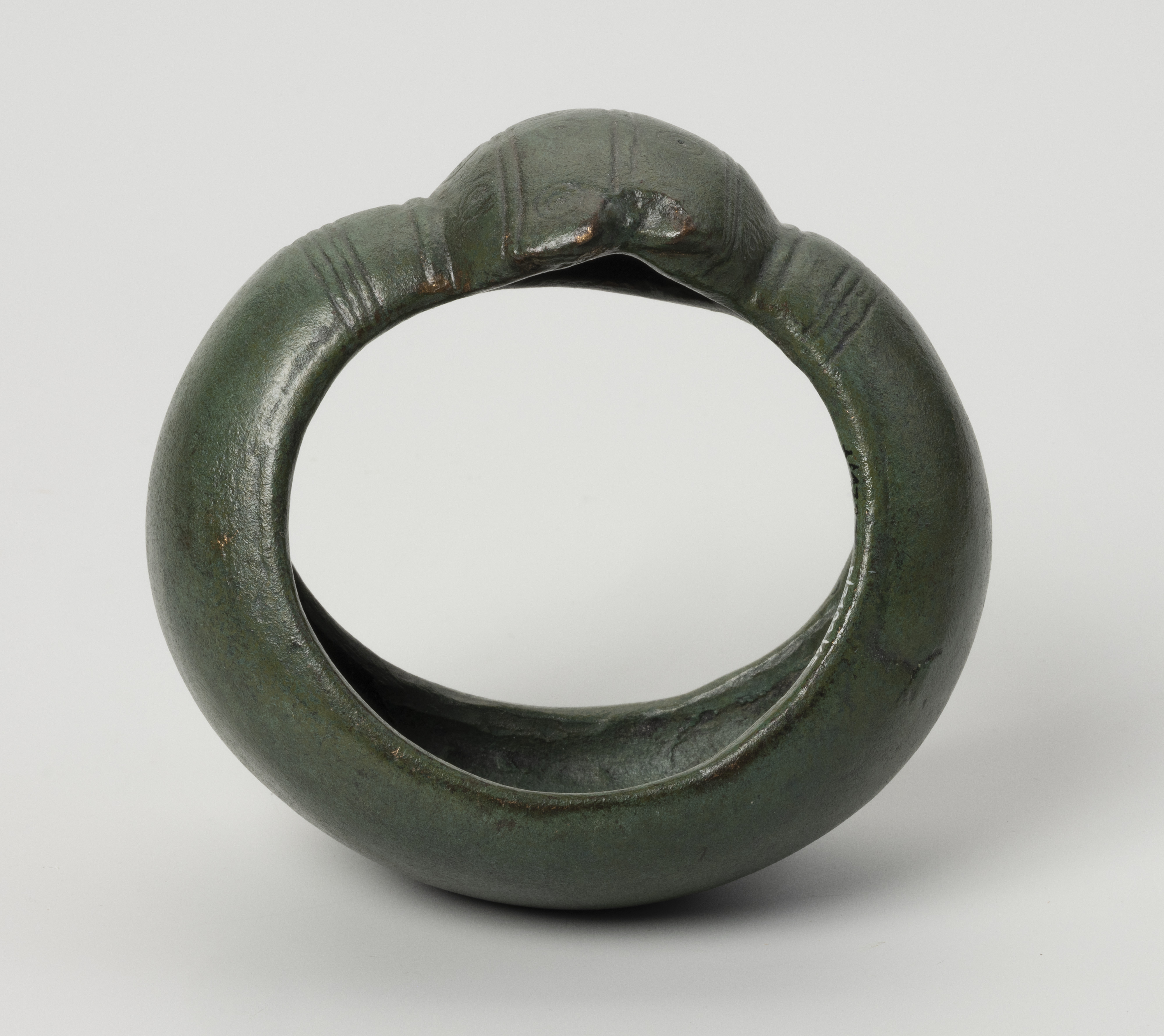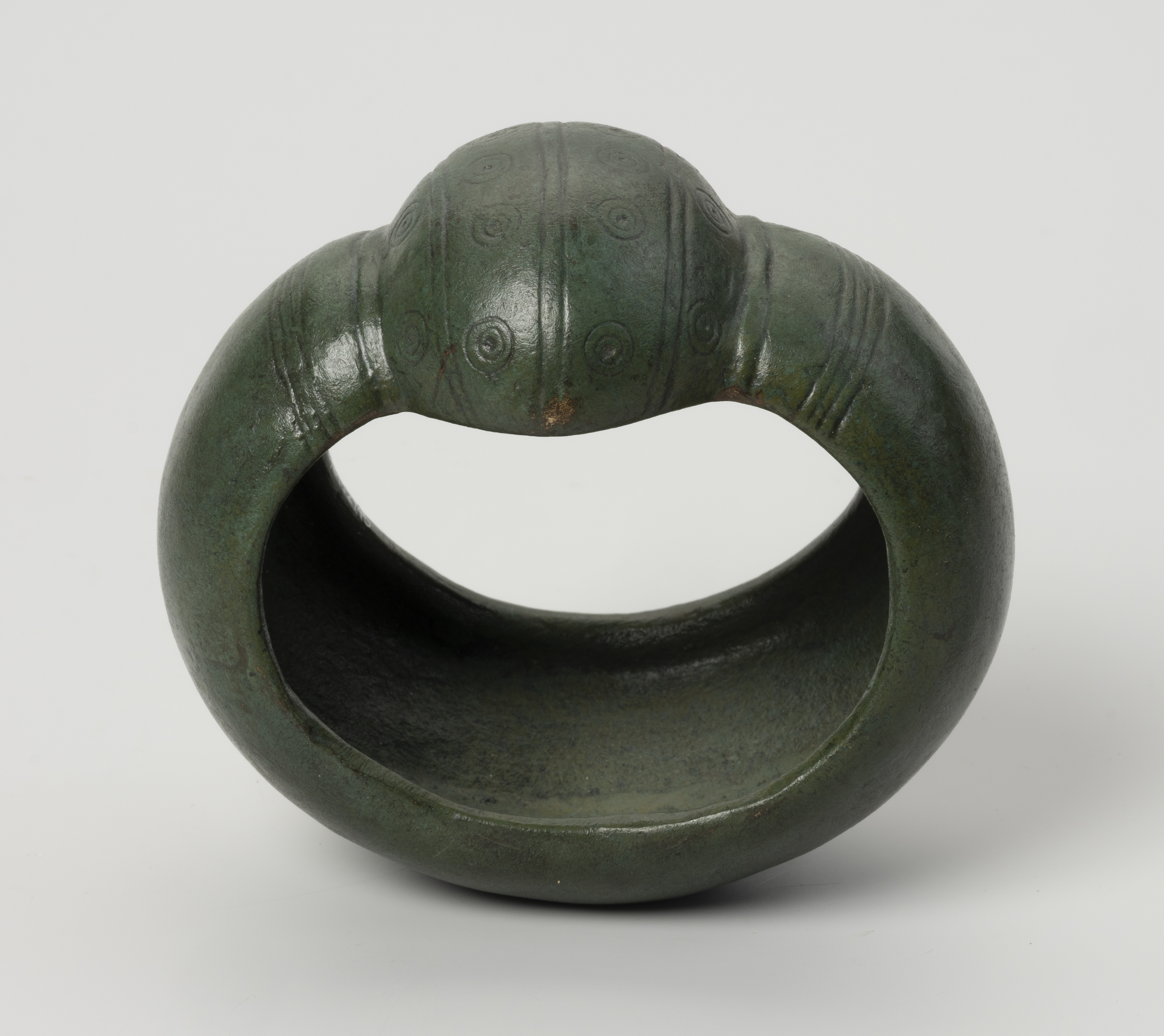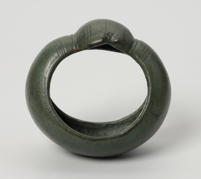 The exhibit on display is a replica of a highly impressive kidney-shaped bracelet. This type of bracelet takes its distinctive name from its shape, which consists of a closed circular or oval band with a prominent widening, referred to as a kidney-shaped bulge, nerka (kidney), or knot. In this case, the band is exceptionally broad, strongly convex, and its edges are sharply curved inward. The bulge itself is large and prominent, decorated with multiple engraved lines and an eyelet-patterned ornament. Archival research and historical records confirm that this object is a replica of a bracelet found alongside an identical counterpart in Kolkowo, a now-vanished settlement that was replaced by the upper reservoir of the Żarnowiec pumped-storage power plant near Gniewino in Lębork County. Interestingly, a replica of the second bracelet is housed in the Museum in Koszalin. The discovery, interpreted as a treasure hoard, was made on 27 November 1936 by a worker, Otto Kolodzik from Gniewino. It was unearthed in a state-owned forest during road construction to Czymanowo in the Pomeranian Voivodeship. Both bronze bracelets were buried at a depth of 0.3–0.4 metres. Immediately after the discovery, the objects were sent to the Pommersches Landesmuseum in Stettin (Pomeranian Regional Museum in Szczecin) for several months. In June 1937, they were transferred to the Museum für Vor- und Frühgeschichte (Museum of Prehistory and Early History) in Berlin, where they are most likely still held today. In exchange, on 7 August 1937, copies of both bracelets were sent to Szczecin, for which the museum paid an appropriate fee. Kidney-shaped bracelets similar to the Kolkowo specimen are found over a broad area of Europe, though they remain relatively rare. So far, isolated examples have been recorded in the Middle Rhine region, Thuringia, along the Havel River, in southern Mecklenburg, and eastern Pomerania. They date from Period V of the Bronze Age through to Hallstatt C, approximately 900–550 BC. Dorota Kozłowska