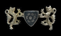 Various types of ornaments made of precious metals belonged to the elements of medieval costumes. Characteristic ornaments, also fulfilling utilitarian functions, in the 14th - 15th centuries were embroidery hooks and those closely connected with one, which consisted of a hook and eyelet and formed a bipartite fastener. The first hooks appeared at the end of the 13th century in central Germany, especially in the cities of the Hanseatic League, to which Szczecin belonged from 1278. In the homes of wealthy Lübeck and Stralsund, located near Szczecin, costume ornaments made of silver were not uncommon. Beautifully decorated embroideries and hook-and-eye items were found in Szczecin in 1999, during archaeological research in the area along the river Oder. They were part of a treasure of Pomeranian ornaments and coins hidden under the floor of one of the houses at Targ Rybny (the Fish Market). One of the embroideries is decorated with images of two walking griffins holding a shield with a coat of arms in the form of a rosette. When shown in profile, the mythical creature was a symbol of many Pomeranian cities, including Szczecin and the princely Griffin dynasty. On the other hand, the rosette motif, i.e., floral and plant decoration, was quite commonly used in the art of the late Middle Ages.