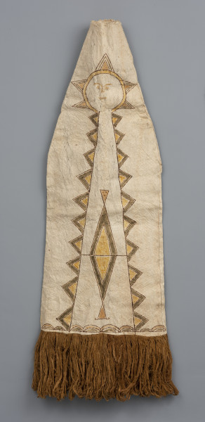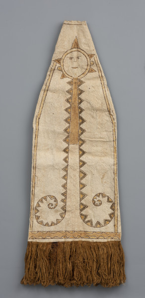 Tukúna (Tikúna) are the indigenous inhabitants of the tropical forests of the state of Amazonas in northwestern Brazil, who call plant fibres obtained from the inner layer of the bark of trees and shrubs, commonly referred to as tapa, are called tururý. The masks prepared from it are made by men. After obtaining the plant material, they soften it in the process of repeated soaking, crushing and drying. Properly prepared tapa is richly decorated. They fill the dark contours sketched with charcoal with various natural plant dyes: yellow, green, red, brown, black. In addition to paintings depicting animals, scenes and characters from Tukún's cosmology, there are images of planes, cars and ships. The presented mask shows mãe de vento – the mother of the wind, a traditional motif of the forces of nature. It symbolizes the spirits that were supposed to protect the main character of the holiday during the girls' initiation rites. In Tukún's beliefs, the wind is also considered to be a force that spreads diseases from the sun.