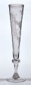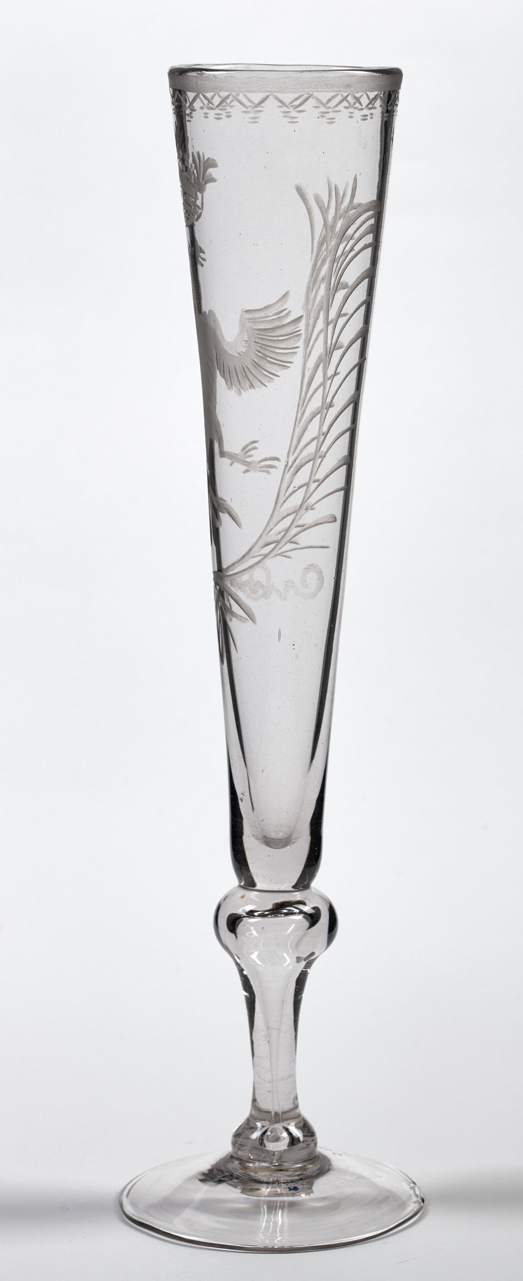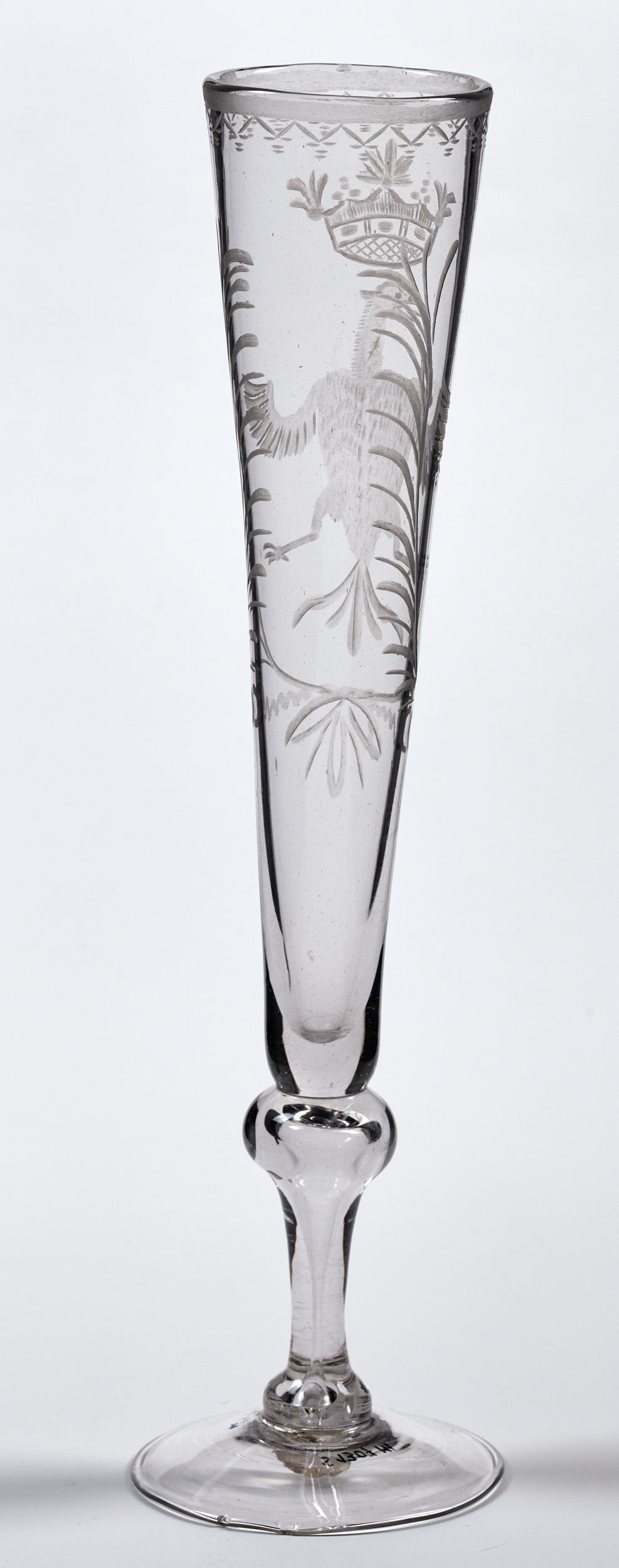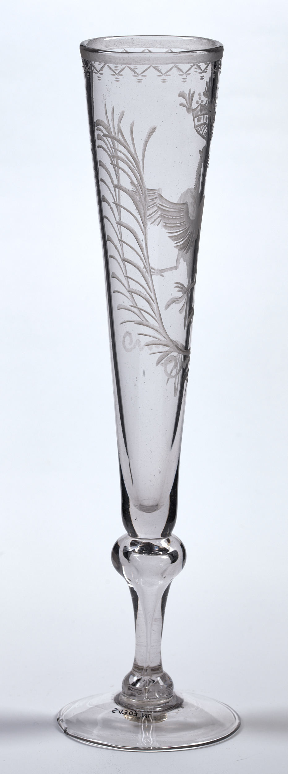The drinking flute was made in the first half of the 18th c., probably in the glass factory near Lubaczów known as Huta Kryształowa ('Crystal Glassworks'), established in 1717 by the hetman Adam Mikołaj Sieniawski. He was married to Elżbieta Lubomirska, daughter of Stanisław Herakliusz Lubomirski - the owner of the Łańcut castle in the years 1699-1702. In the Łańcut Polish glassware collection, products from these nearby glassworks are the majority. It was one of the oldest Polish glass factories that achieved a very high, European craft level in its products. It was headed by Franciszek Fremel, an outstanding Saxon specialist, brought to Poland in 1710 by Augustus II the Strong. The glassworks were active throughout the 18th century. It produced glass tableware and candlesticks. Champagne flutes with a narrow and slender bowl on a baluster stem and a round foot were distinctive among toasting glasses. The above drinking flute is made of clear glass. It has a large, round foot, a tall, hollow baluster stem, and a slender, conical bowl with an oval bottom. The bowl is decorated with a carved eagle with a crown framed by a stylised palm branch. A geometric ornament is carved around the edge of the bowl.