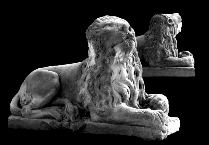 The sandstone statue depicts a lion lying on a rectangular slab with its head raised and turned to the right. Its hind paws and tail are tucked under its body, while its front paws extend forward, with the left one resting on a sphere. The lion’s thick, wavy mane reaches down to its paws. The lion can be seen in the Utility Courtyard (the courtyard with a majestic plane tree), where, paired with a twin sculpture, it guards the entrance to the Inner Courtyard of the palace.