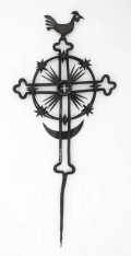 Crosses with rays and a cockerel were not widespread in the Lublin region. The tin figure of a crowing bird was placed on the top of a vertical arm either permanently or movably on an axis as in windlasses, thanks to which it rotated under the influence of the wind. The figure of the symbolic hen usually took on a realistic form, but there were also far-reaching stylisations and simplifications resulting in an unspecified bird (see E/379/ML). Especially with older specimens it is difficult to verify whether this was an intentional artistic act or the result of blacksmithing skills.