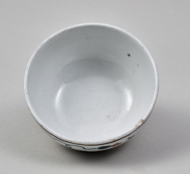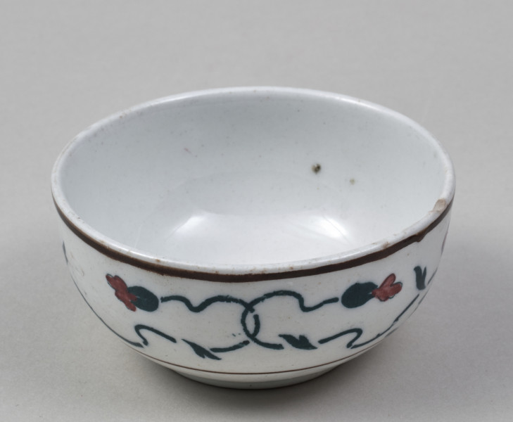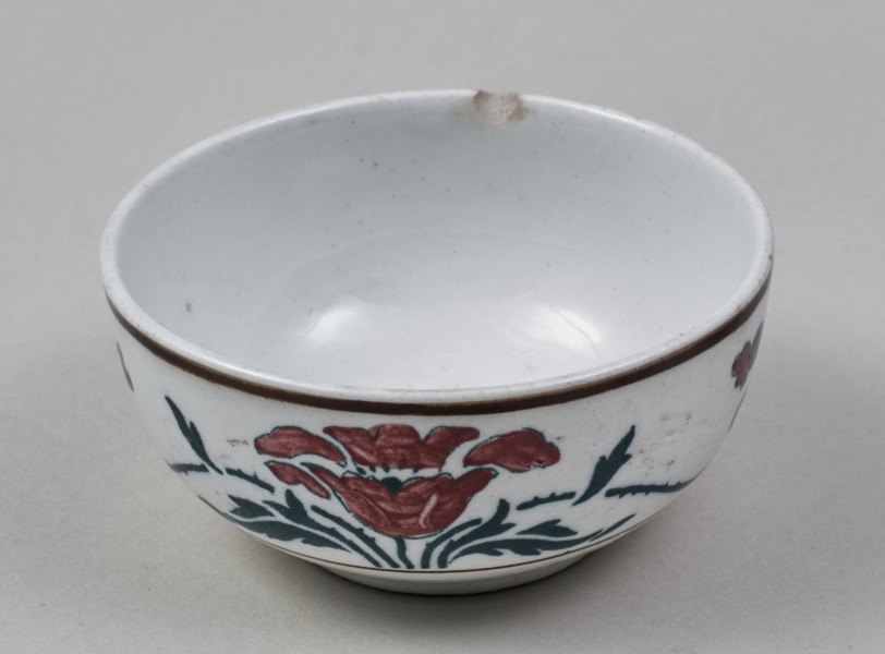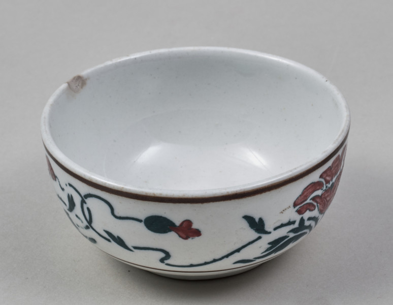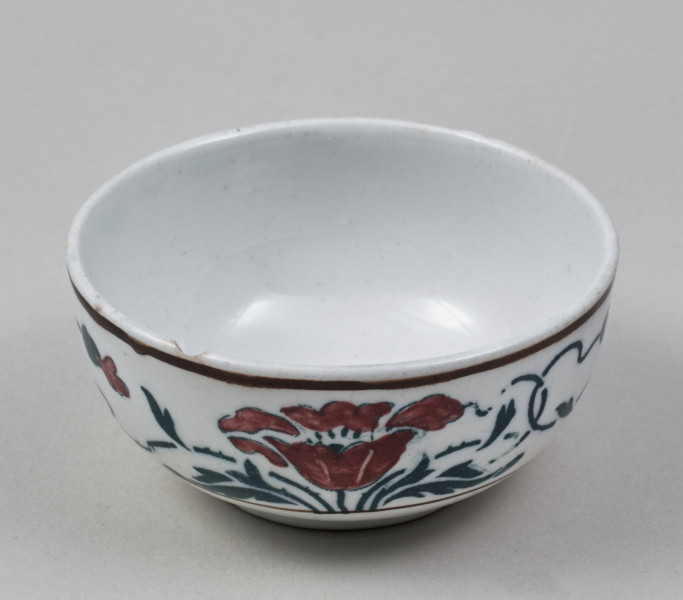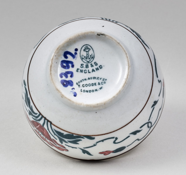 Cup – small, faience, hemispherical with a slightly defined foot, decorated around the rim with a wide strip of plant decoration, consisting of a two-tone pattern of stylised poppies (burgundy-red flower petals, dark green stem leaves and poppies, passing between two brown stripes). The decoration consists of a symmetrically repeated pattern, which fits around the rim of the cup, featuring a cup-shaped poppy standing between two pairs of leafy, long, and S-shaped twisted stems with one ending in a poppy head and the other in a dormant bud. The foot, like the decoration strip, is bordered with a brown stripe. On the underside of the foot, there are two green stamped marks. One is the manufacturer's signature depicting an anchor in an oval, with the inscription S.B. and S /ENGLAND underneath, the other is the signature of the London store SOUTH AUDLEY ST/ T. GOODE&Co/ LONDON. W.