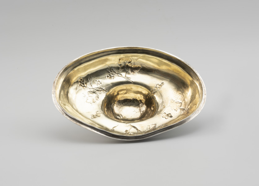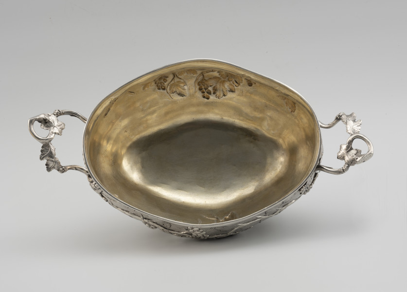 Among the most impressive tableware items were tureens – lidded vessels used to serve meat-and-vegetable dishes or soups, such as the one from the Szczecin collection. This tureen stands out for its undulating, organic shape and intricate decoration of grapevine branches entwining the body and lid. The goldsmith’s mastery is evident in the quality of the embossing and the smooth transitions from shallow relief to fully three-dimensional branches, which form the handles on the body and the finial on the lid.