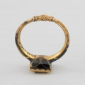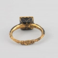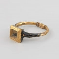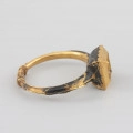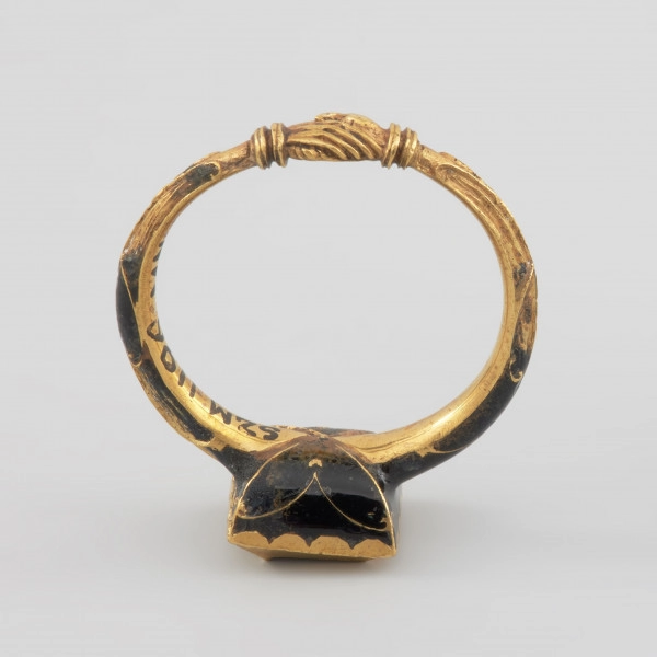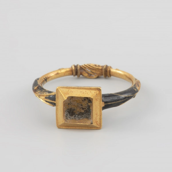 The motif of clasped hands has been used in engagement and wedding jewellery since the Middle Ages as an element decorating rings and clasps. During the wedding ceremony, the bride and groom shook hands as a sign of their marriage vow. The motif of hands referred to this gesture and was a symbol of an unbreakable marriage knot. The presented ring was excavated from the sarcophagus of the Pomeranian Duke Franciszek I from the crypt of the Griffin family under the Castle Church in Szczecin in 1946. The Duke probably received it as a present on his marriage with the Saxon Princess Sophia, sister of the Saxon electors from the House of Wettin, Christian II (1583-1611) and John George I (1585-1656). The marriage took place thanks to the involvement of Erdmutha of Brandenburg, a widow of the Pomeranian Duke John Frederick, Princess Sophia being her niece. The formal wedding took place in the summer of 1610 in Dresden. Thanks to Francis I's posthumous image in the collection of the Cathedral in Merseburg and the description of the Duke's attire in the commemorative prints celebrating his funeral ceremony, we know that the ring was initially decorated with a 'large, costly' diamond of plaque cut. The Duke wore it on his left index finger. The lower part of the stone setting is covered in black enamel with a delicate gold ornament made in the groove enamel technique. The outside of the ring is similarly decorated. The rings with a single large diamond decorated with black enamel were popular in the 1st half of the 17th century. This type of ring was found, for example, in the sarcophagus of the Pomeranian Duke Ernest Bogislav von Croy (1620-1684). It belonged to his mother, Anna of Pomerania (1590-1660), the youngest sister of Duke Francis I.