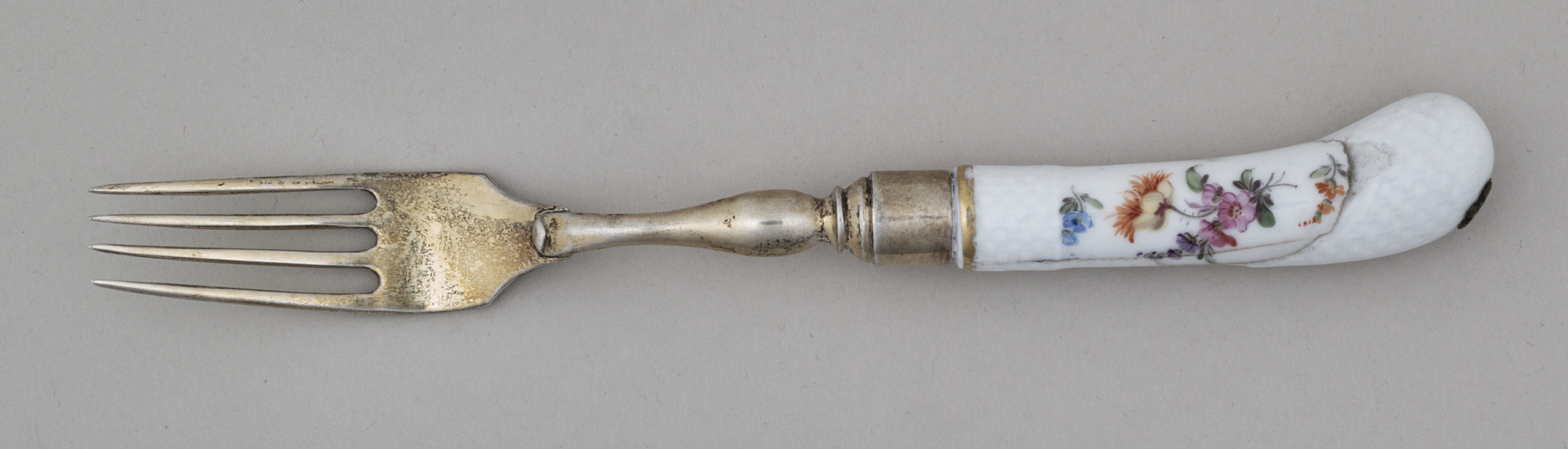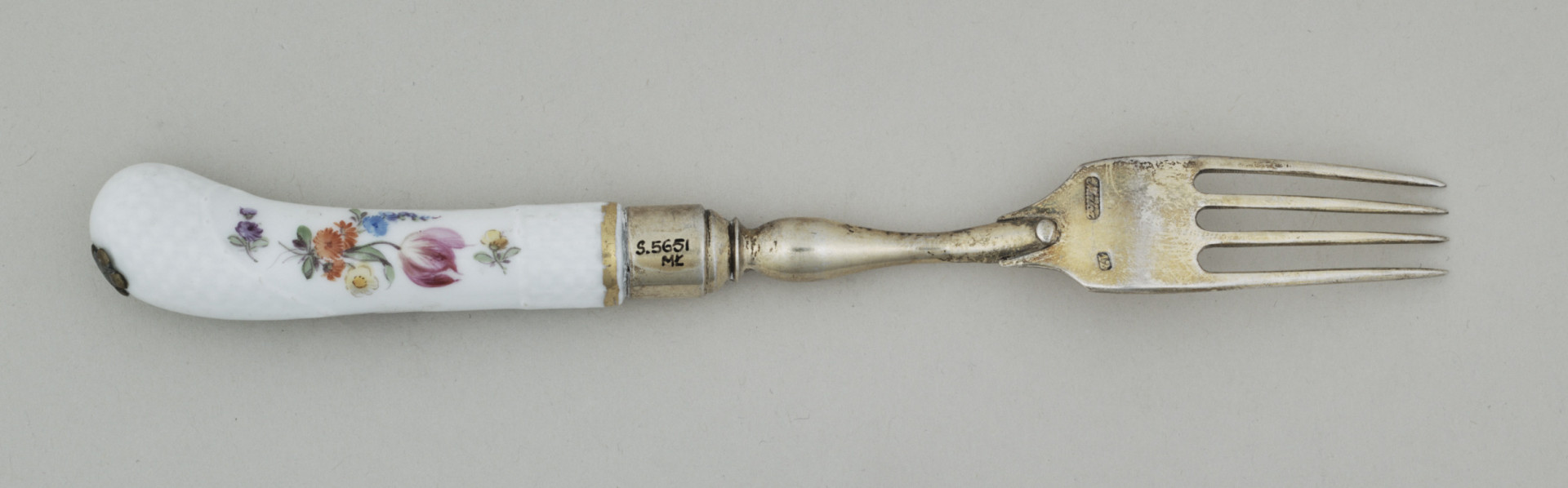 Breakfast fork with four tines. The tines are curved and taper towards the tip. The handle, made of gilded silver and white porcelain overlay, is bent to the right and adorned with a three-dimensional, raised chequerboard pattern at both ends. It features painted decoration on both sides in the form of colourful flowers. On the obverse, there is a bouquet consisting of alcea, wild roses, and purple sweet peas. On the reverse, there is a pink tulip, marigolds, and blue delphinium along with a cornflower. On the underside of the tines, there is the hallmark "Malcz" and the mark "12."