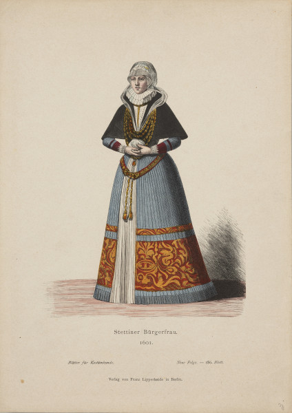 Interest in the folk culture of various German regions became evident during the Romantic period when artists sought inspiration in local folklore, the charm of rural landscapes, folk costumes, songs, and legends. The artistic admiration and collection of knowledge about the culture of different parts of the country formed the foundation of the emerging German national consciousness. It also solidified the birth of regional studies at the end of the 19th century, often pioneered by collectors and enthusiasts of history, literature, and art. An intriguing collection in the field of German costume history belonged to the Berlin publishing couple Franz von Lipperheide (1838–1906) and his wife Frieda (1840–1896). Frieda, who came from a baronial family, joined the editorial team of the fashion magazine Der Bazar as a young illustrator and writer, where she met her future husband, the bookseller Franz Lipperheide. Together, they founded the Franz Lipperheide publishing house, producing publications on the history of clothing and the women's magazine Die Modenwelt, which, translated into several languages, was distributed in many European cities. The Lipperheides became pioneers of costume studies, collecting archival materials and artifacts related to historical customs and fashion, particularly embroidery and lacework, as well as jewelry and military uniforms. In 1892, they donated their impressive collection to the royal museums in Berlin. The National Museum in Szczecin holds a printed engraving depicting the costume of a Szczecin townswoman from 1601, published by their Berlin publishing house Blätter für Costümkunde, edited by the artist and costume expert August von Heyden (1827–1897). The townswoman is shown wearing a richly decorated outfit indicative of her wealth. Around her waist hangs an ornate belt, and four gold chains, a typical piece of jewelry for affluent German women of the late 16th century, dangle from beneath the ruffled Renaissance collar around her neck. The cap on her head, covered with a delicate white scarf, signifies that she is married. The conical shape of her skirt and the ruff reflect the influence of Spanish fashion, which also shaped the tastes of the Pomeranian region at the turn of the 16th and 17th centuries. Małgorzata Peszko
