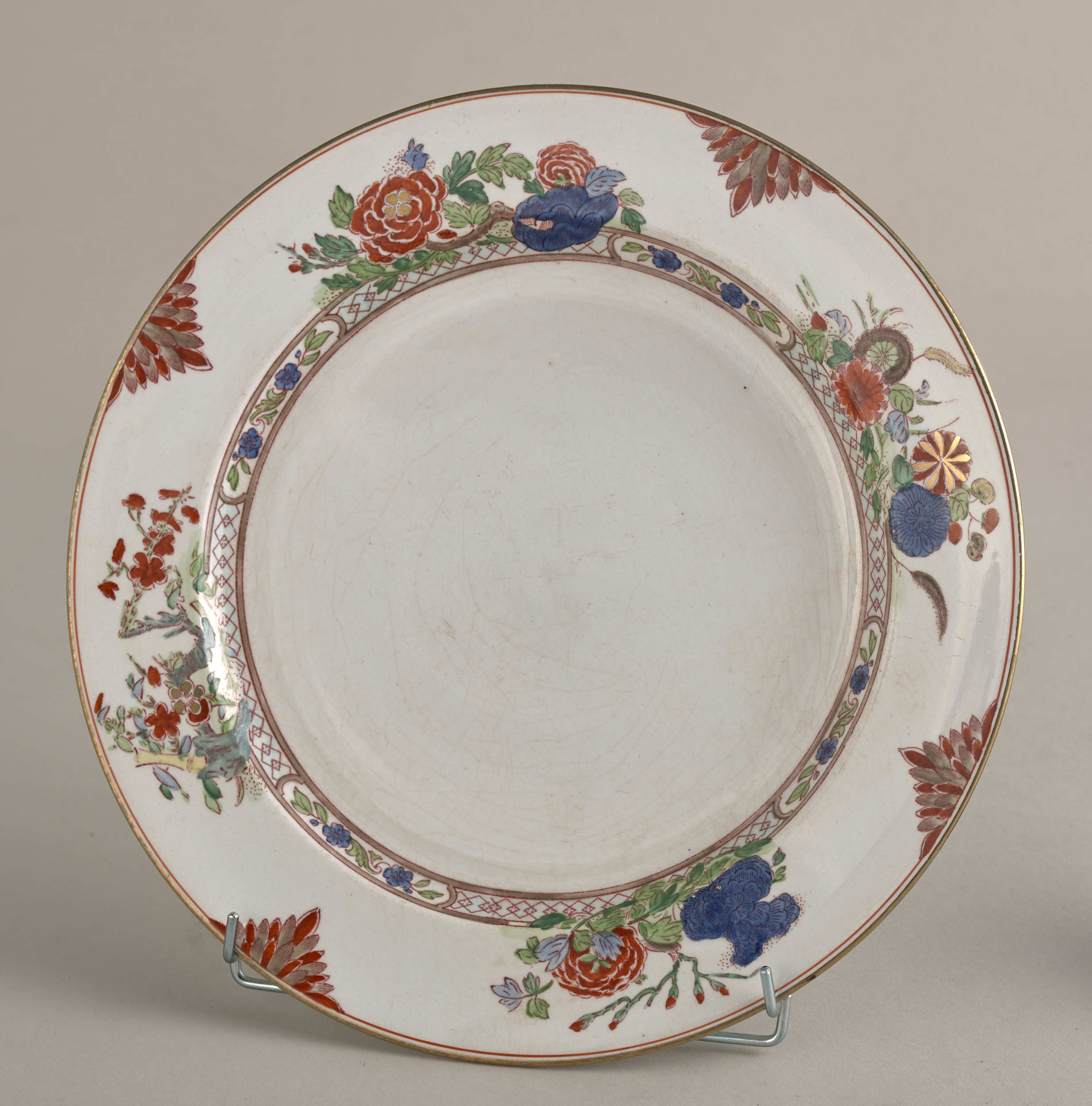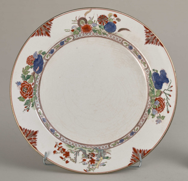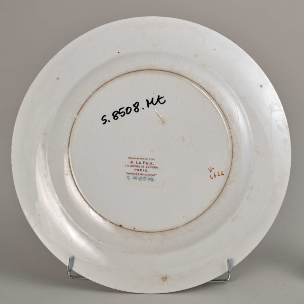Dinner plate, faience with a slightly cream shade, covered with a grid of decorative glaze cracks, decorated with paintings in the Far Eastern type with floral and geometric motifs concentrated in the lip part. A detailed drawing of the decoration pattern is printed in purple and - on the enamel - hand-painted with paints in several colours: rusty red, dark blue, green, and sand-beige. Less used colours are light blue, steel green, celadon and yellow. This decoration consists of a strip of geometric ornament with a rhombus motif, running just below the edge of the indentation, then four large floral and plant compositions- one of them with the motif of a broken bush, arranged on the lip of the plate, close to the strip of ornament. These compositions are separated by leafy semi-rosettes. Gold is found only on the strip that laminates the edge of the lip and on small elements of three flowers in large compositions. The back of the plate is covered with gray spots under the enamel. Visible markings: in the central point the letter "B", factory reference number "BOOTHS" – both stamped in mass- and a large seal printed under glazed in burgundy colour: "MANUFACTURED FOR:/A.LA. PAIX,/34.AVENUE DE L'OPERA, /PARIS./IMPORTE D'ANGLETERRE". Under it, there is an inscription with the current inventory number. England, Hanley, nineteenth century.