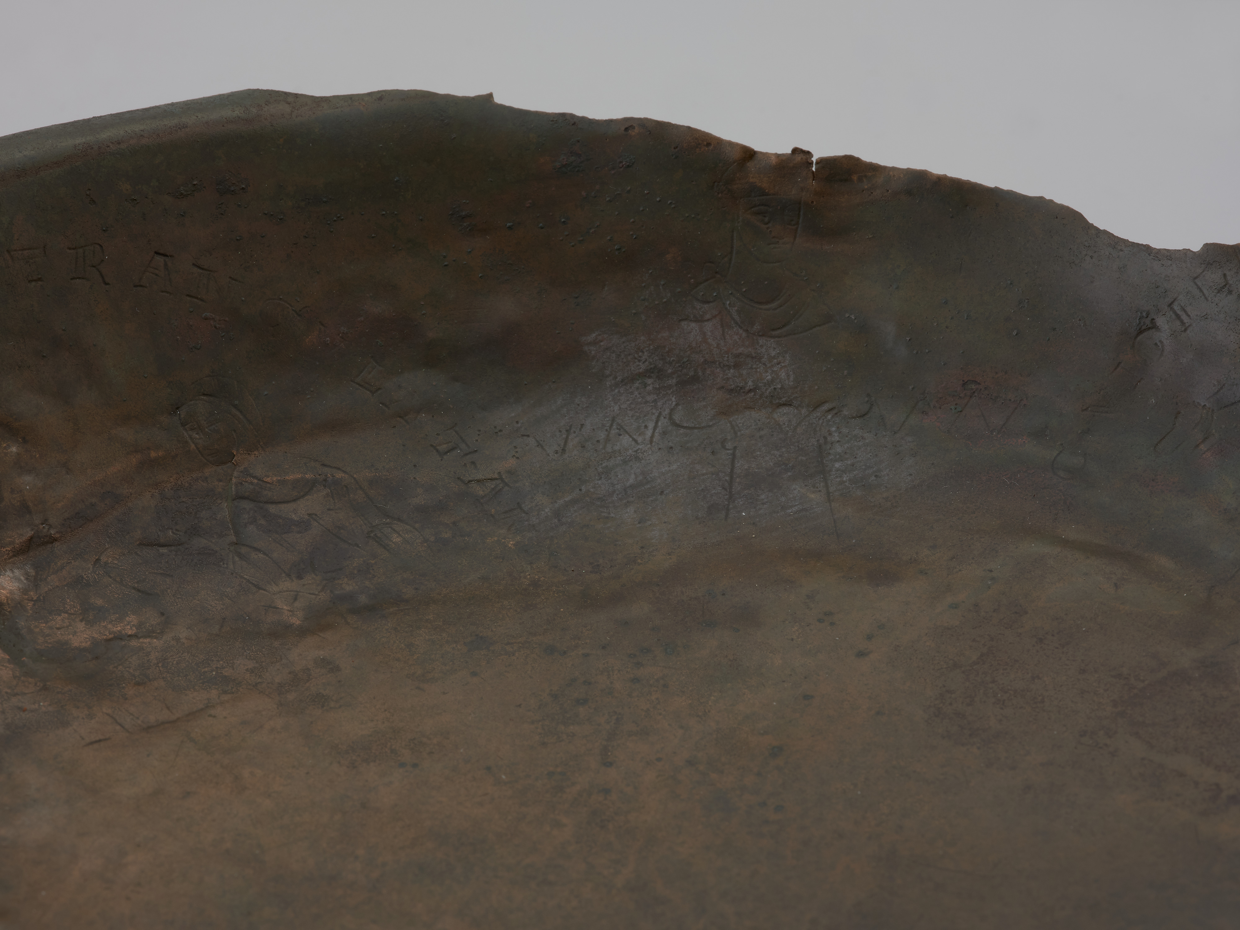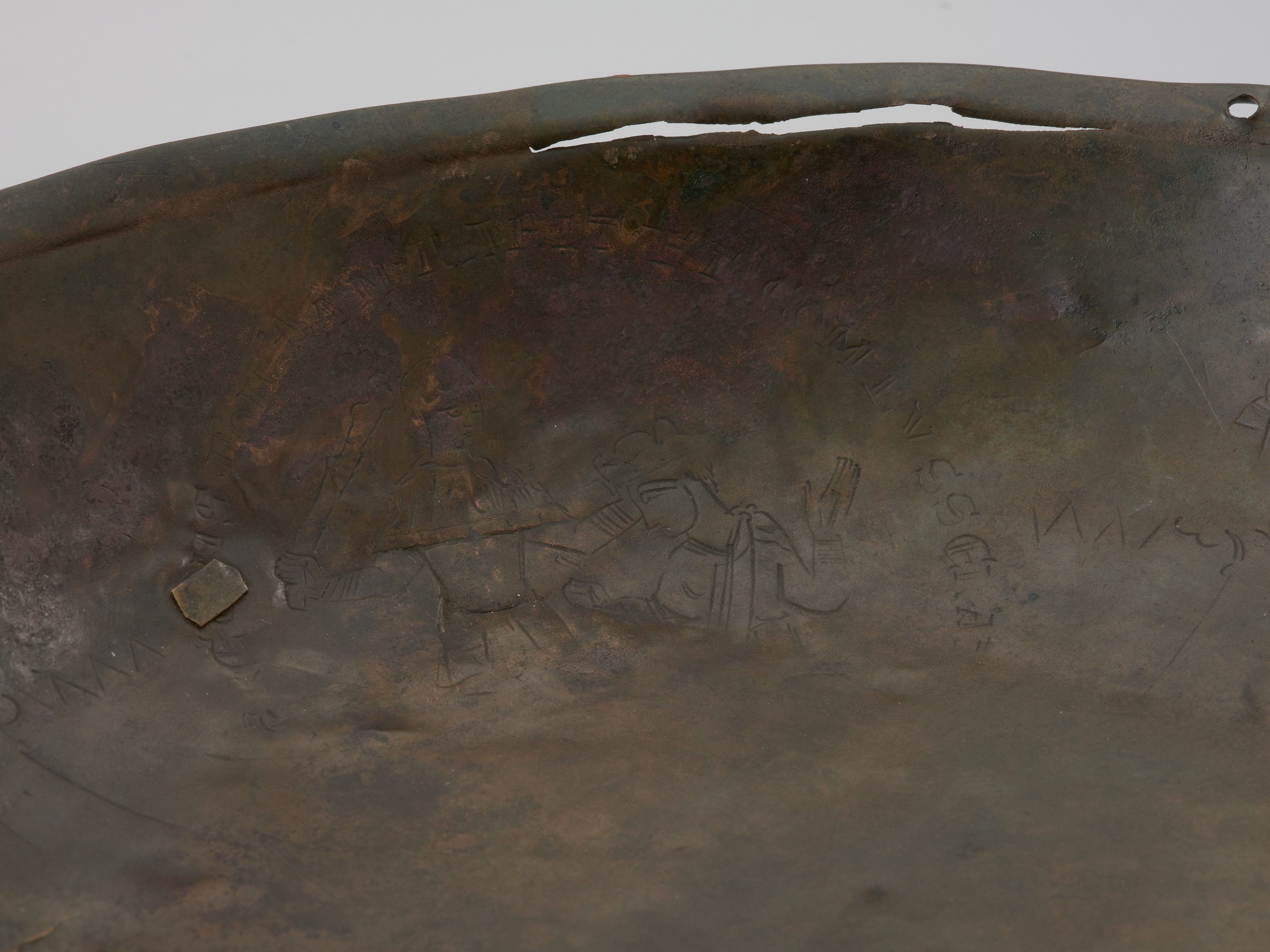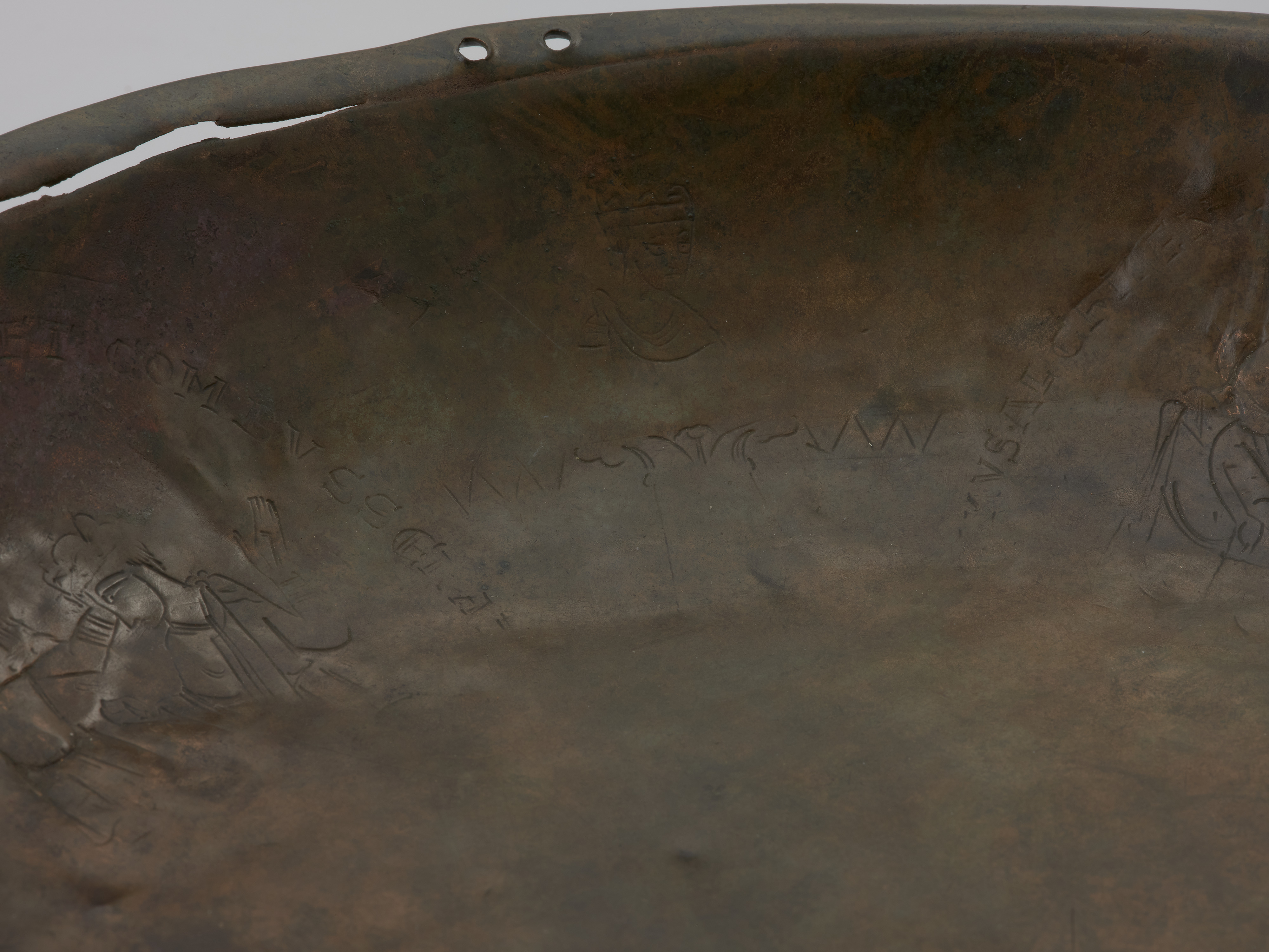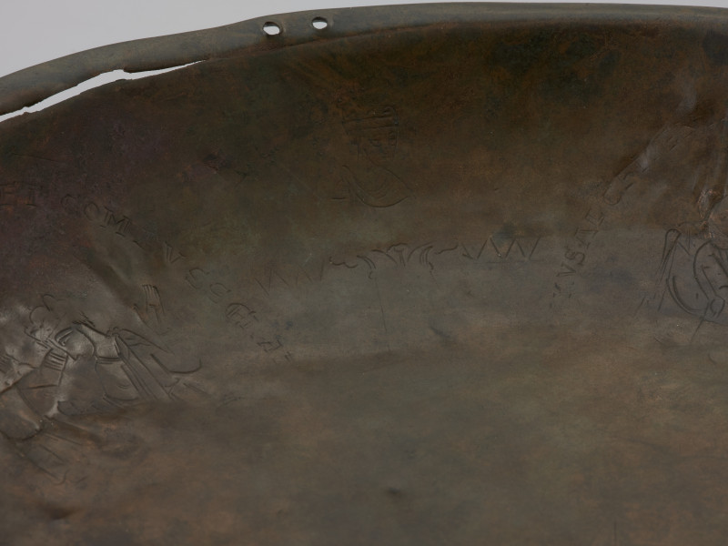 Four symmetrically arranged oval medallions surrounded by inscriptions in Latin Roman majuscule are on the inner surface. Inside each medallion, there are figural representations. The lower parts of the inscriptions are illegible today due to the way the bowl was used. One of the scenes is also damaged. Between the medallions, male crowned busts are visible. The inscriptions and figural motifs form a coherent whole. They are quotations from a medieval eclogue, bucolic writing in the exquisite language, whose authorship is attributed to Theodolus. Literary works of this type were used as textbooks for learning Latin in the Middle Ages. In this case, inscriptions and engravings illustrate the life and deeds of the mythical Heracles. The first scene depicts the hero's birth, and the second shows the strangling of a snake by the little Hercules sent to him by Hera. The third scene - the least legible - shows the theft of apples in the garden of Hesperides and the murder of its guardian, the “unquiet” dragon Ladon. The last medallion depicts the abduction of the cattle herds of the Tartessos ruler Gerion - the tenth work of Hercules. The bowl from Nowe Objezierze is the second vessel decorated with scenes from the life of the Greek hero known in Europe. The first one is in the British Museum in London. The inscriptions are the oldest fragments of the eclogue of Theodolus in Poland. Bowls with inscriptions and mythological and Christian scenes were used in monasteries and during liturgical ceremonies.