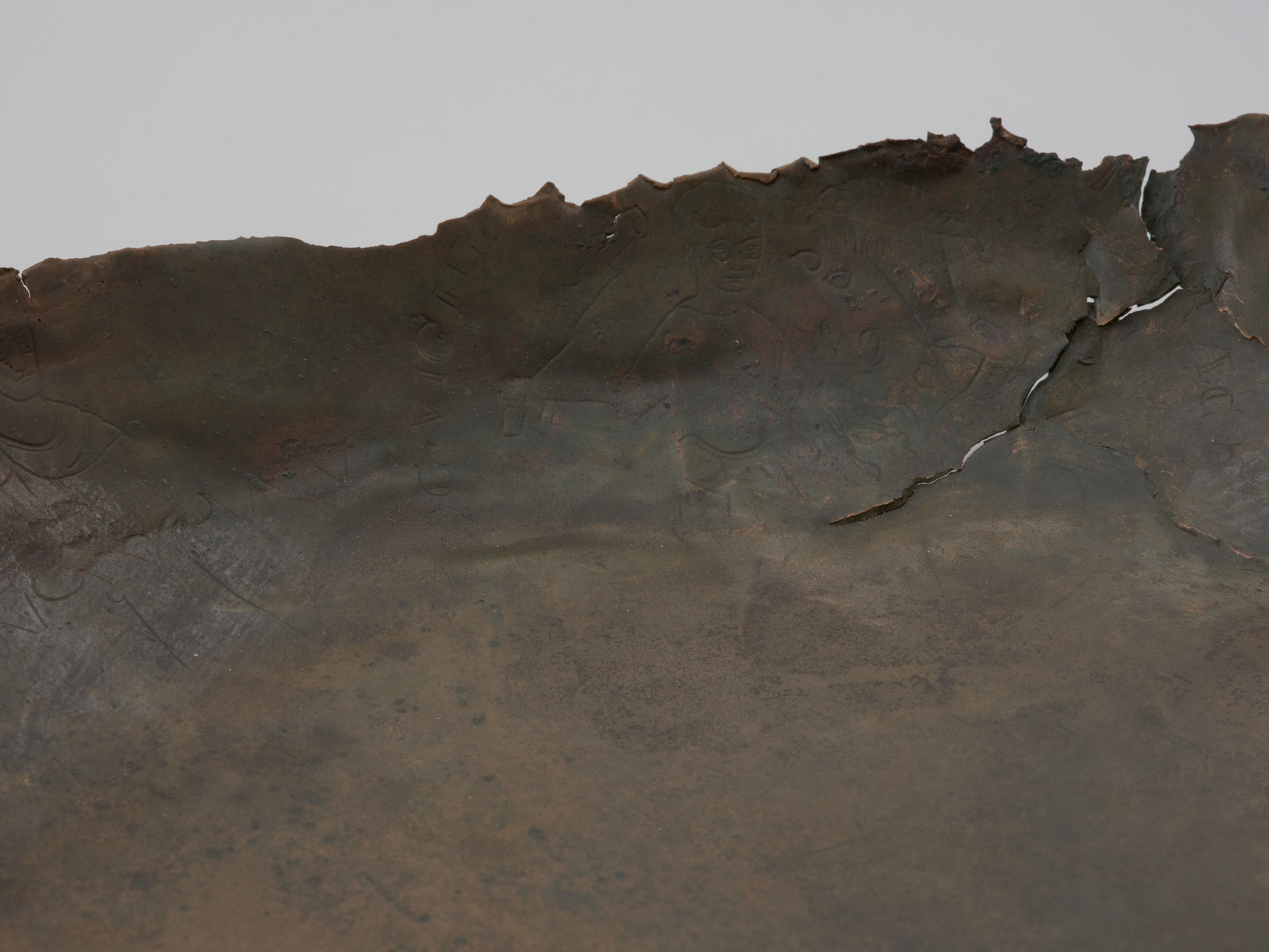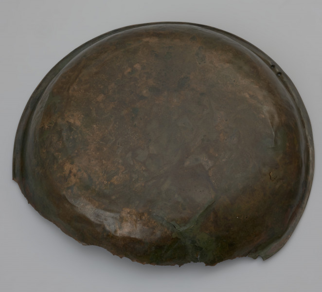 The vessel is made of one sheet of copper alloy by mechanical splitting and shaping. It has a narrow outward turned rim with a rounded and slightly thickened edge, two holes, and a flat bottom, in which a small patch is visible, which is evidence of repairs.