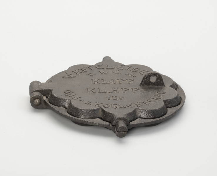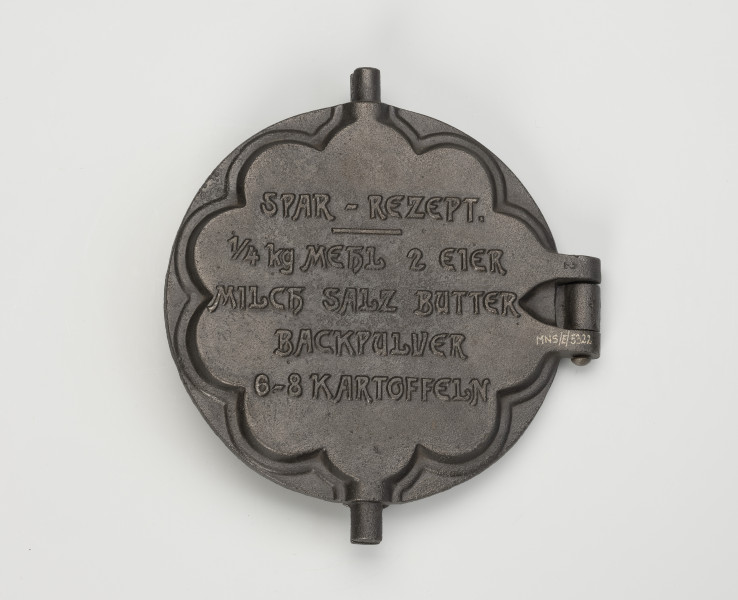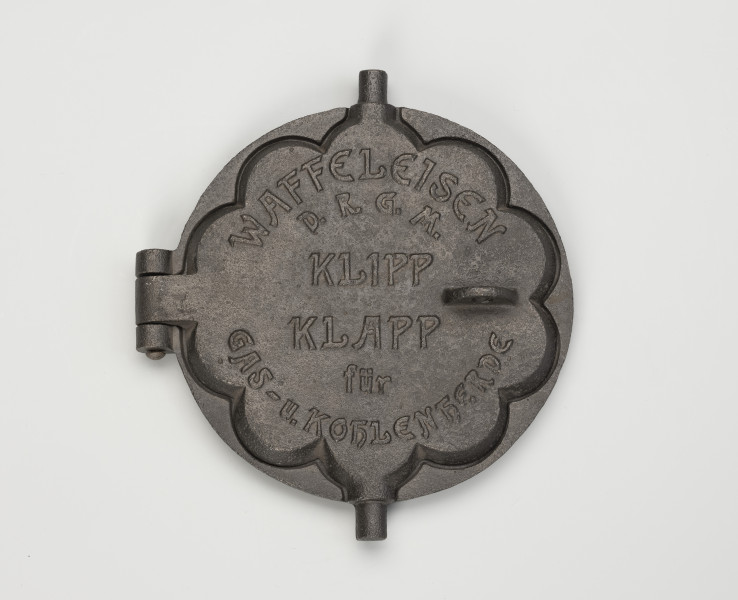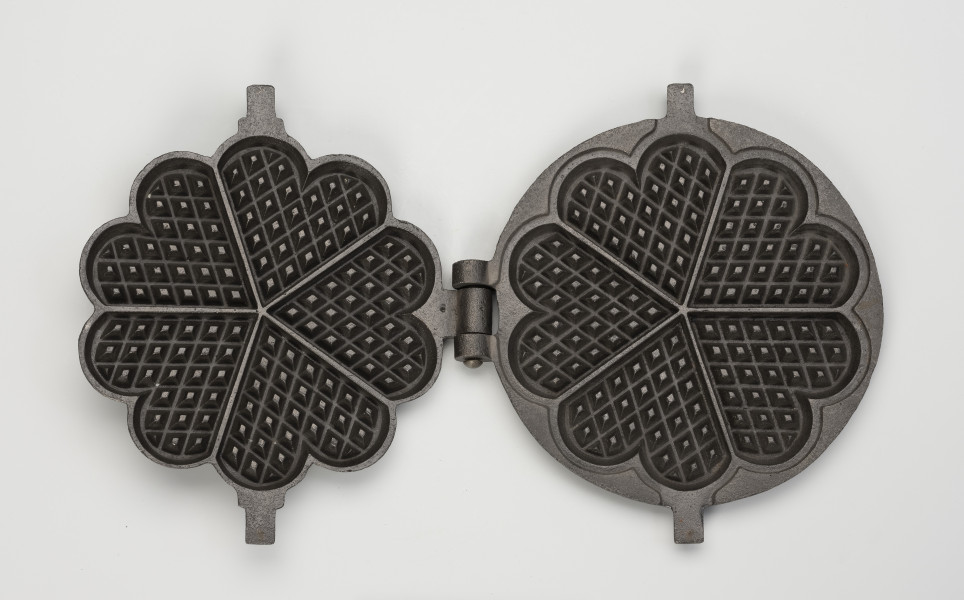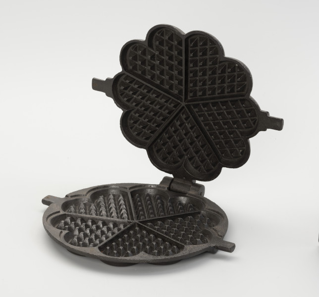 Heavy, cast-iron waffle irons were commonly found in Pomeranian kitchens. This homemade type of waffle was made from flour, milk, eggs, butter, and yeast. Sometimes, potatoes were also added to the batter. To achieve the right consistency (similar to pancake batter), the ingredients had to be used in the correct proportions. In the early 20th century, manufacturers often placed such information on the lid or base of the iron. The waffles did not contain sugar; only after they were baked were they sprinkled with it or spread with jam. Before baking, the iron was greased with goose or pork fat, and then the appropriate portion of batter was poured in. Once it was properly baked, the waffle iron was turned to the other side using a poker. Preparing waffles did not take much time, and a large number could be made quickly. Today, waffles, served with a variety of toppings, remain a popular, mainly sweet snack. They are baked in electric waffle irons, but cast-iron waffle irons can also be bought. They are very similar to their now-antique predecessors that were placed on hot stove rings or originally even inserted directly into the fire. Usi g the iron presented here, waffles could be baked in the popular heart shape filled with a grid pattern, a design that has been common since the 19th century. On its bottom, there is a recipe for the batter, and on the lid, there is information that the iron is suitable for use on both gas and coal stoves. Agnieszka Słowińska