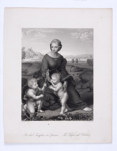 The artwork on display is an artistic steel engraving reproduction of a well-known painting by Raphael Santi (1483–1520), Madonna with Child, also known as the Belvedere Madonna. The painting, created in 1506, is currently held at the Kunsthistorisches Museum in Vienna. The composition portrays the Virgin Mary as a young woman in the Renaissance attire of a wealthy Italian, with an elegant and smooth hairstyle, though barefoot. She is seated on a stone against a flat landscape background, watching over two small, naked boys –Jesus and Saint John the Baptist – playing at her feet with a cross made of sticks. Saint John kneels, offering the cross to Jesus, who eagerly takes it. In the background, beyond a strip of water, hills and the outlines of Jerusalem's buildings are visible. To the left of the buildings, Golgotha dominates the scene, with a cross standing below its summit. The wooden cross with which the children play, along with the massive cross crowning Golgotha, foreshadows the martyrdom of Jesus. The engraving originates from the publication by Adolph Görling (1820–1877), Belvedere or The Galleries of Vienna, a Collection of Steel Engravings of Outstanding Paintings, with Text Including Notes on the Painters and the Schools to Which They Belong, as well as Relevant Historical Novellas and Genre Pieces, published in 1860 by Albert Henry Payne. It is one of the illustrations included in 19th-century albums popular for showcasing the collections of major art museums. The author of the engraving, English engraver William French (1815–1898), created reproductive graphics based on works by both old and contemporary artists. His works included religious and genre scenes, landscapes, and documentary illustrations. French worked for many years in Leipzig at the Englische Kunstanstalt, a publishing house established in 1845 by another Englishman, Albert Henry Payne (1812–1902). Ewa Gwiazdowska