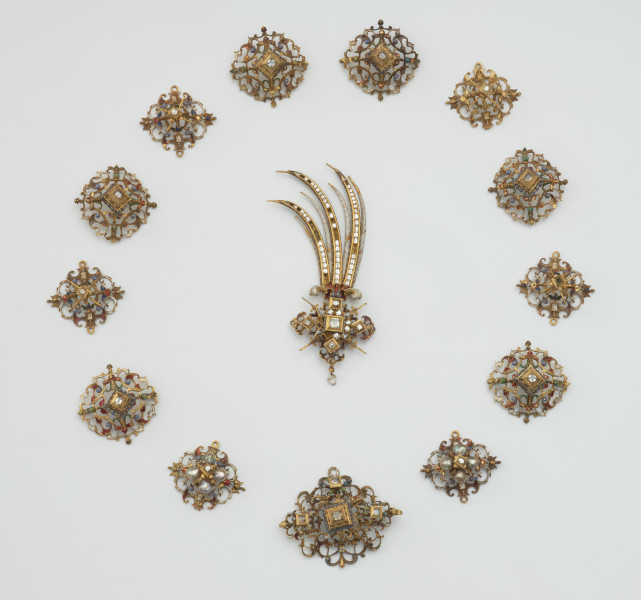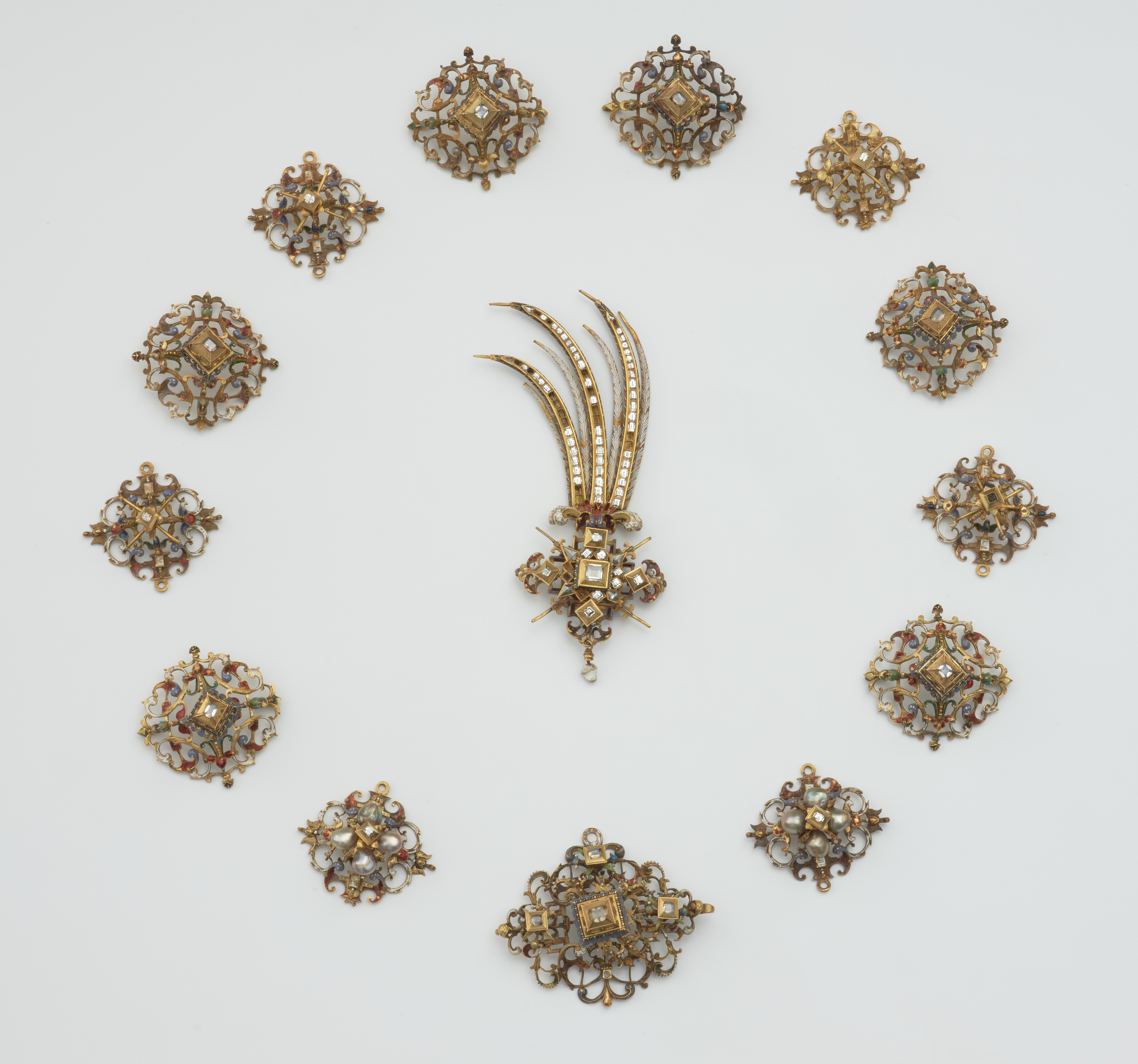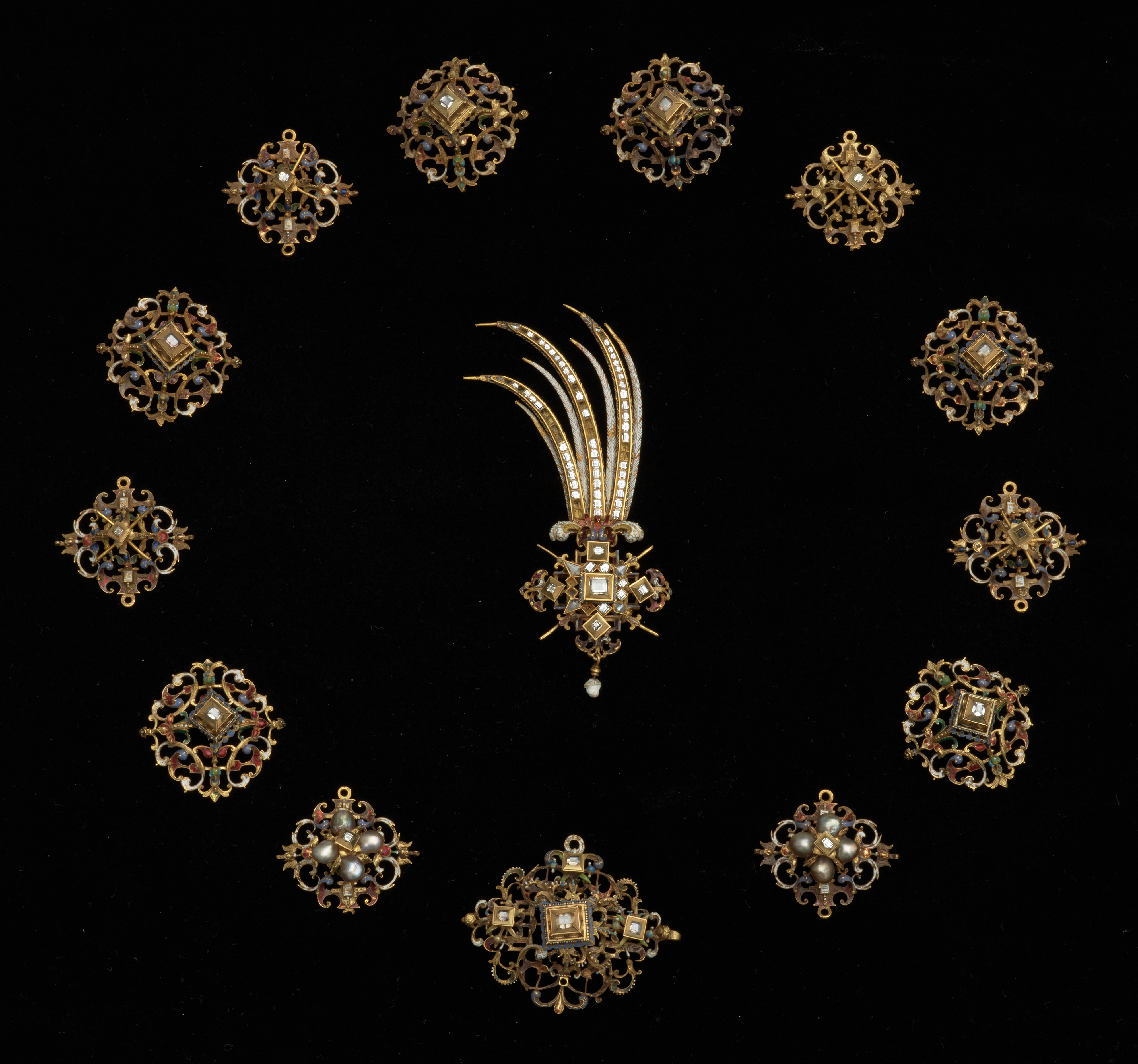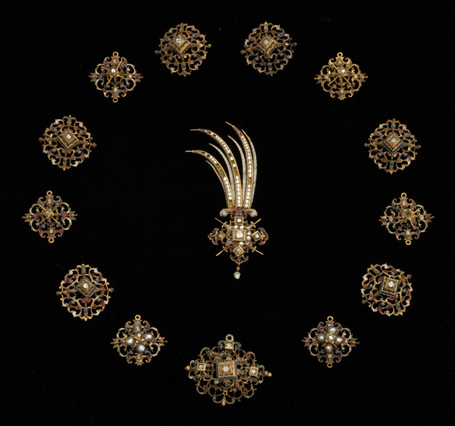 Aigrettes were hat ornaments used for attaching a feather headpiece, usually ostrich or heron feathers. In the second half of the 16th century, they usually took the form of brooches, with which a bunch of real feathers was attached to the headgear. With time, ornaments with feathers made in the jewellery technique also started to be designed. One of the most beautiful jewels of this type is the aigrette of Duke Francis I of Pomerania. Set with diamonds, decorated with pearls and colourful enamel, it has the shape of a rosette topped with seven jewellery feathers. Originally the jewel's composition was completed with pearls placed in corners of the rosette and at the tips of the feathers. Only one of them, suspended at the bottom, has been fragmentarily preserved to this day. The Szczecin jewel is characterised by an interesting Mannerist composition based on the interpenetration and interplay of rectangular and rhomboidal forms. Researchers associate it with Jacob Mores the Elder, a Hamburg goldsmith, commissioned among others by the kings of Denmark, the Electors of Saxony and the Dukes of Schleswig-Holstein. In his surviving drawings, designs of similarly composed ornaments can be found.The aigrette, together with 13 rosettes, decorated the cap in which Duke Francis I was buried. In the collection of Merseburg Cathedral, there is a small, the Duke's posthumous image preserved from 1621, in which he is shown in a black and gold hood decorated with rosettes fastened in a chain and with a centrally placed aigrette fastened with a tuft of black heron feathers, traditionally used in burials. The painting captures the original colour effect of the jewel, with distinctive accents of red enamel and the white of the pearls harmonising with the white enamelled feathers and volutes. On the other hand, in an unpreserved portrait of the Duke from 1616, made by Johann Leonisch, the same aigrette is pinned to the front of the hat, directly above the clasp, against the background of an amazing bundle of ostrich feathers. Although aigrettes were popular ornaments, few have survived to our times, and the jewel from the Szczecin collection is one of the most valuable.
