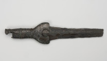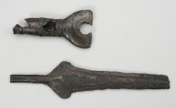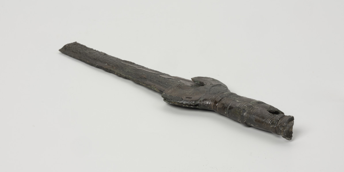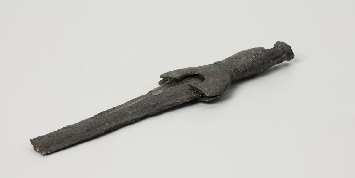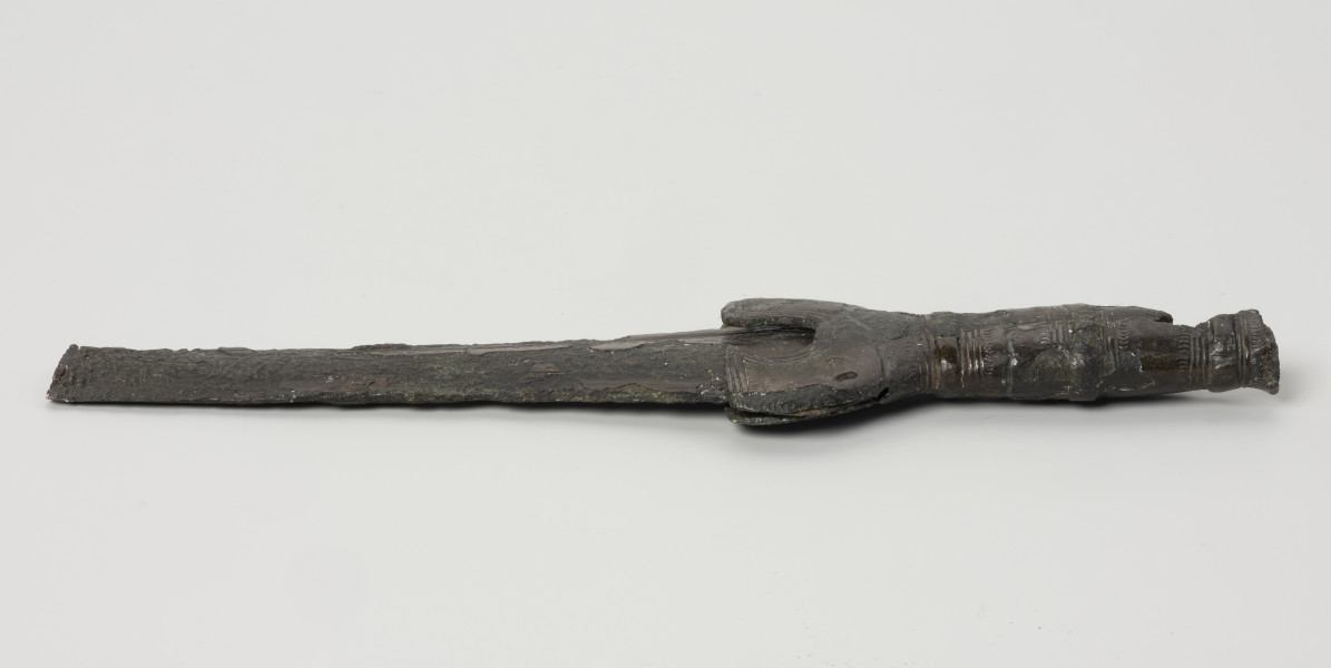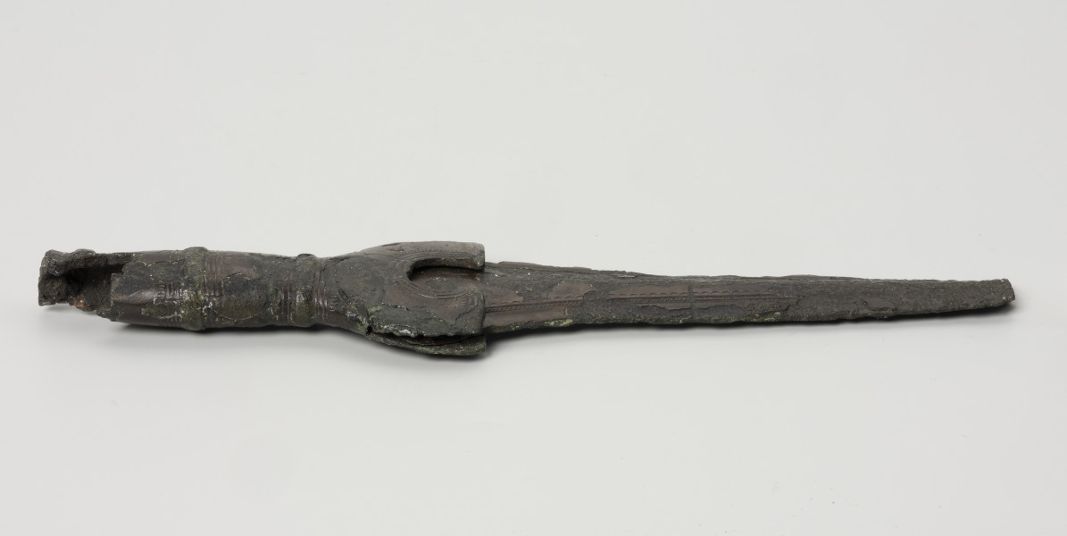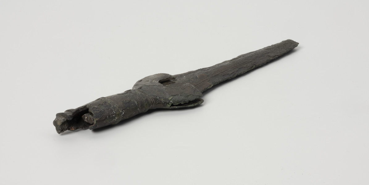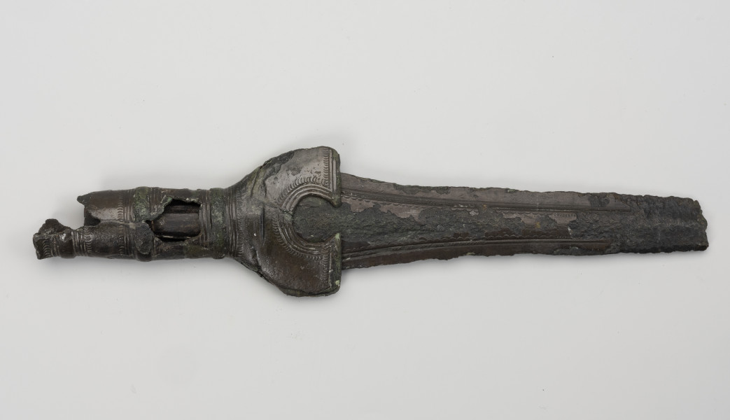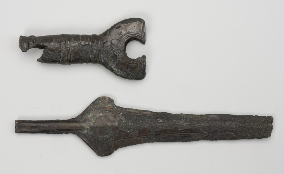 This intriguing sword, though only preserved in a 22.7 cm fragment, features a slender blade as its main component, with cutting edges on both sides. Traces of its original glossy surface have survived in some areas, revealing fine grooves on both sides, accentuated by delicate decorative elements in the form of small incisions and curved motifs. The sword’s hilt is equally ornate. Despite significant damage, its refined shape remains visible, with a smooth, polished surface adorned with engraved lines and small incisions. The hilt was most likely topped with two small volutes, allowing this specimen to be classified as an antenna sword, dated to Period V of the Bronze Age (approximately 900–750 BC). Around 180 examples of this type of weapon are known from across Europe, with concentrations in central Italy, southern Germany, Switzerland, northern Germany, and Pomerania, where 25 antenna swords have been recorded. The vast majority were produced in local workshops, with only three identified as imports from the southwestern Alpine region. This specimen was donated in 1935 by Gizela Behm from Kliniska Wielkie to the Pommersches Landesmuseum in Stettin (Pomeranian Regional Museum in Szczecin). The only known details regarding its discovery suggest that a farmer found the sword around 1933 in a field between Kliniska Wielkie (formerly Groß Christinenberg) and Łękinia (formerly Friedrichsdorf), a now-abandoned settlement located about 3 km west of Kliniska. Dorota Kozłowskac