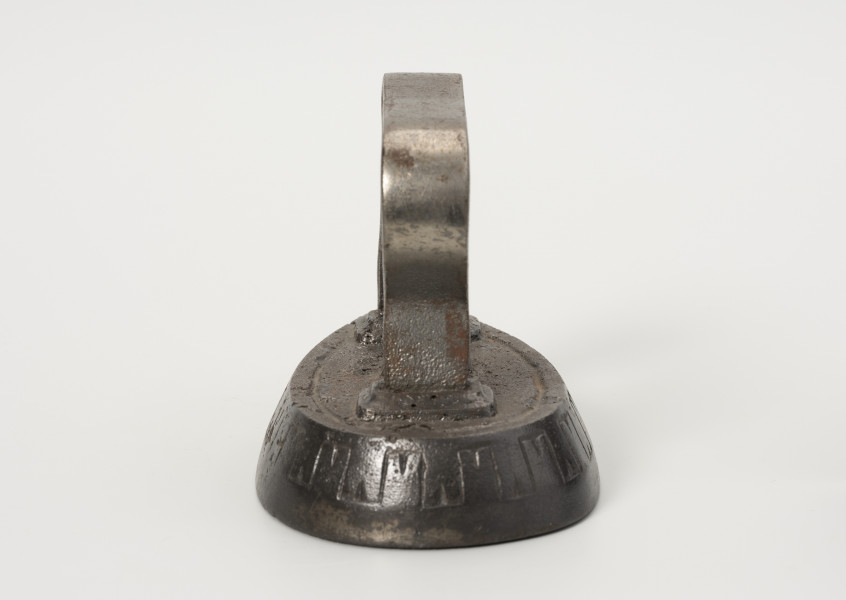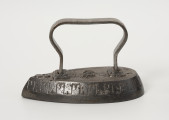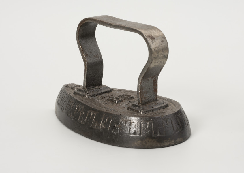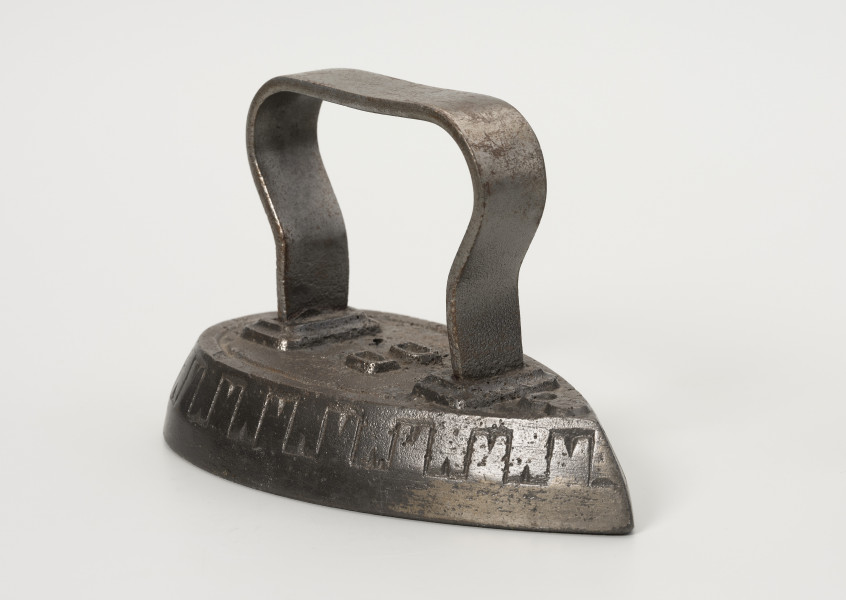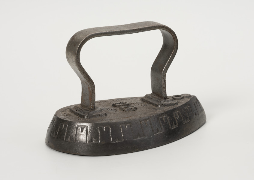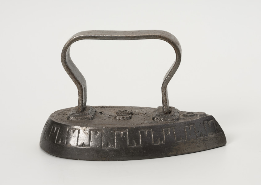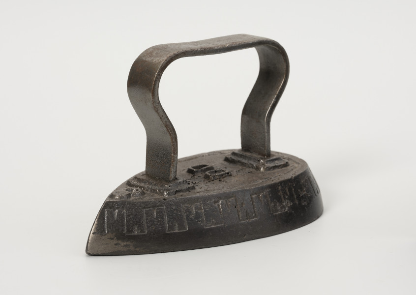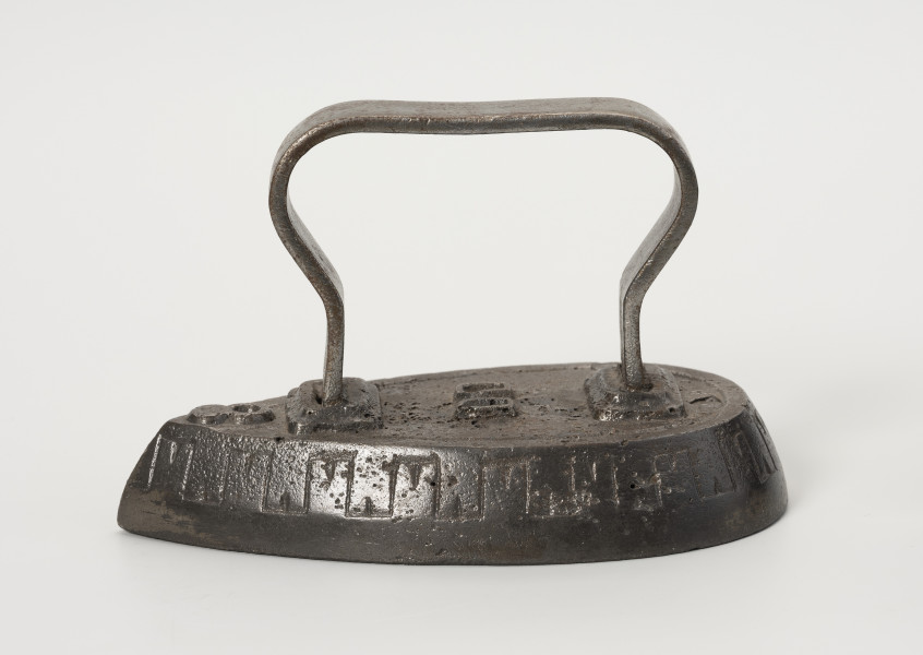Storage irons, also called solid-plate irons, were devices used for ironing that resembled modern electric irons in appearance. The design of storage irons was simple: they consisted of a solid, heavy block of metal with a characteristic shape and a handle. Initially, they were made from forged iron, but later, cast iron was used. Solid-plate irons were widespread across Europe, including Poland, and in some regions, they were still in use after the Second World War. Before use, the iron had to be heated, typically done at home on a kitchen stove. The main drawback of the storage iron was that it lost heat quickly. To maintain continuous ironing, at least two irons were needed – while one was in use, another was heated. Another issue was that storage irons usually had metal handles, which easily became hot. To avoid burns, the handles were wrapped in thick fabric or leather, which was inconvenient and increased the risk of dropping the iron. An innovative solution was patented in 1871 by American Mary Potts (1850–1922). Her design featured a securely fastened and detachable handle, accompanied by a set of iron bases that could be heated, allowing for the ironing of different types of clothes. This solution quickly gained popularity in the American market and eventually became widespread, with detachable-handle irons being produced in many places around the world. The storage iron presented here comes from the ethnographic collection of the National Museum in Szczecin. It is decorated on the sides with a continuous geometric pattern. Agnieszka Słowińsk