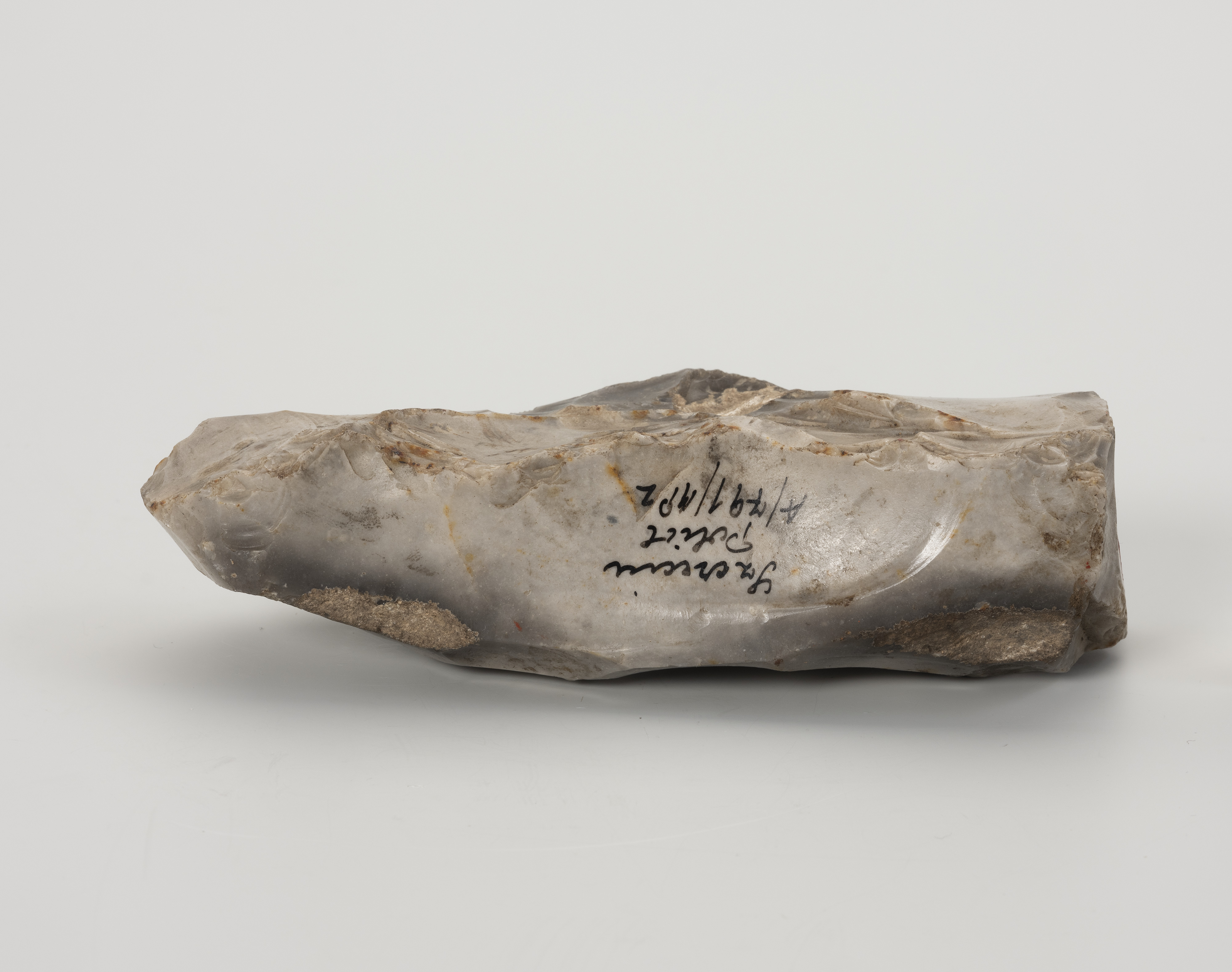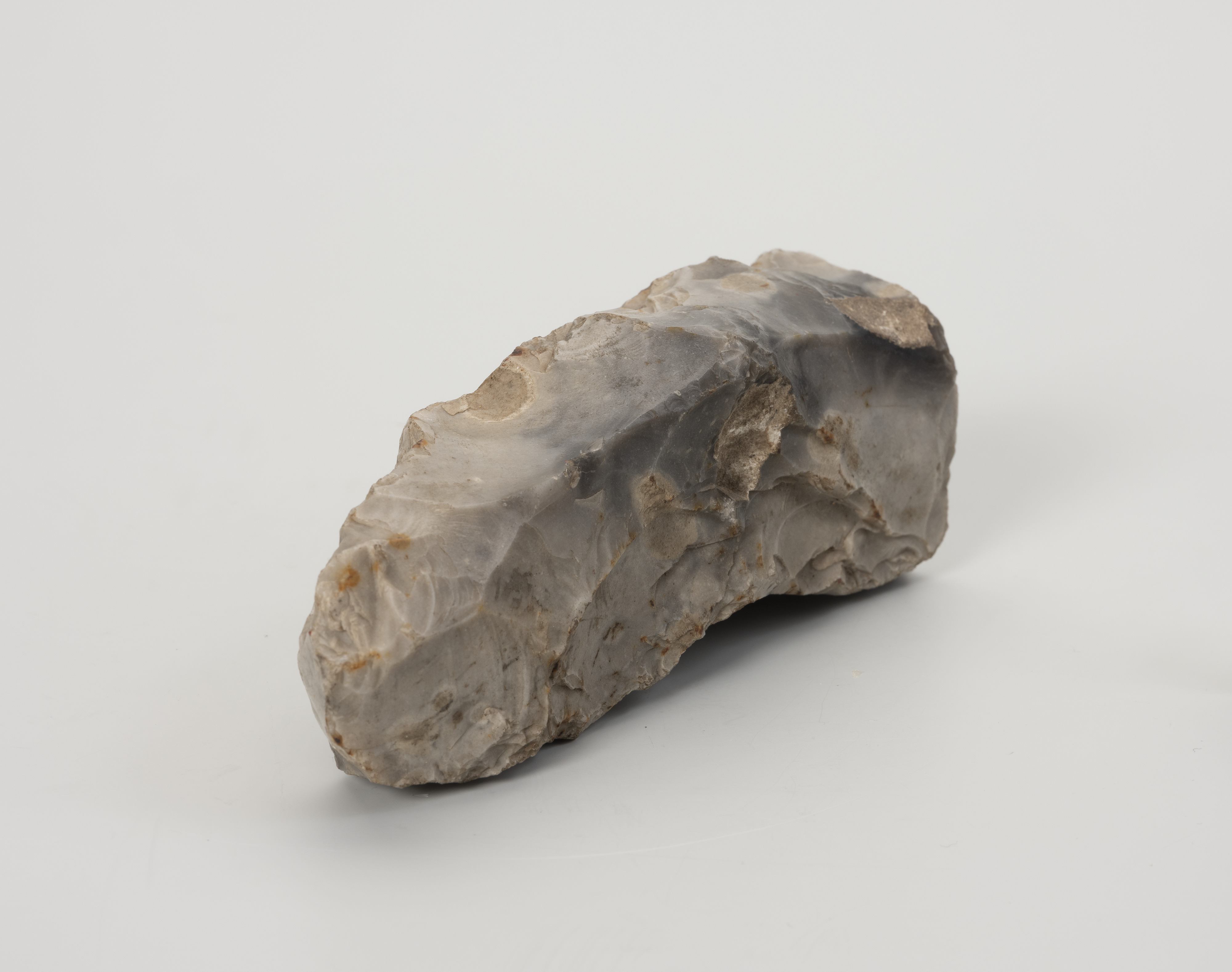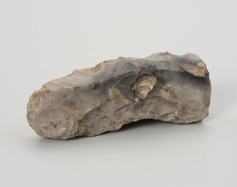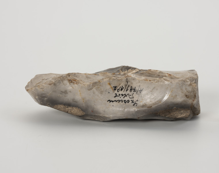 The precise context in which the presented chopper from Police was discovered remains unknown. Its original inventory number from the Gesellschaft für Pommersche Geschichte und Altertumskunde (1824–1945) suggests that it was donated to the Society in the second or third decade of the 20th century. The entire collection was later transferred to the Provinzialmuseum Pommerscher Altertümer, opened in 1927 and operating under the name Pommersches Landesmuseum in Stettin from 1934 to 1945. The chopper was made from a high-quality nodule of locally occurring Cretaceous flint. It takes the form of an elongated wedge with a quadrangular cross-section. The tool was shaped from a small core using a hard hammerstone. However, the butt end was left as a natural, unmodified surface. The entire surface of the chopper shows significant wear in the form of crushing, polishing and flaking, most likely caused by heavy use – probably digging. This suggests that it served as the head of a pick or hoe. Choppers are tools designed for heavy-duty tasks, typically used as heads for composite implements consisting of shafts, bindings and working parts made from stone, flint, bone, antler and wood. They were used to process both hard materials, such as wood, antler or bone, and soft ones like skin and meat. They were also used for digging or breaking through ice. Such tools were a typical element of the toolkit of Mesolithic hunter-gatherer communities living in the forests of Western Pomerania during the early and middle Holocene (c. 9600–4100 BC). Michał Adamczyk