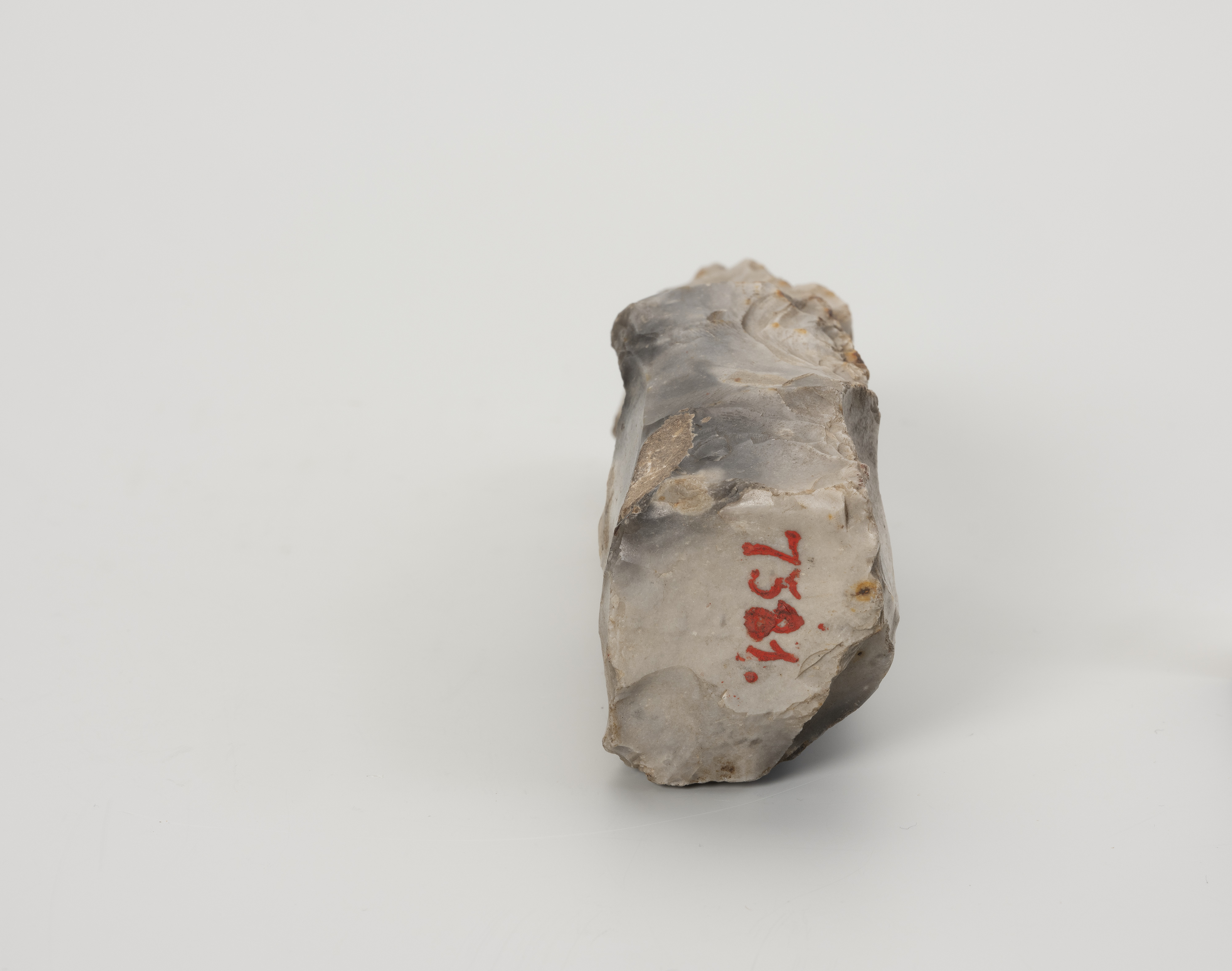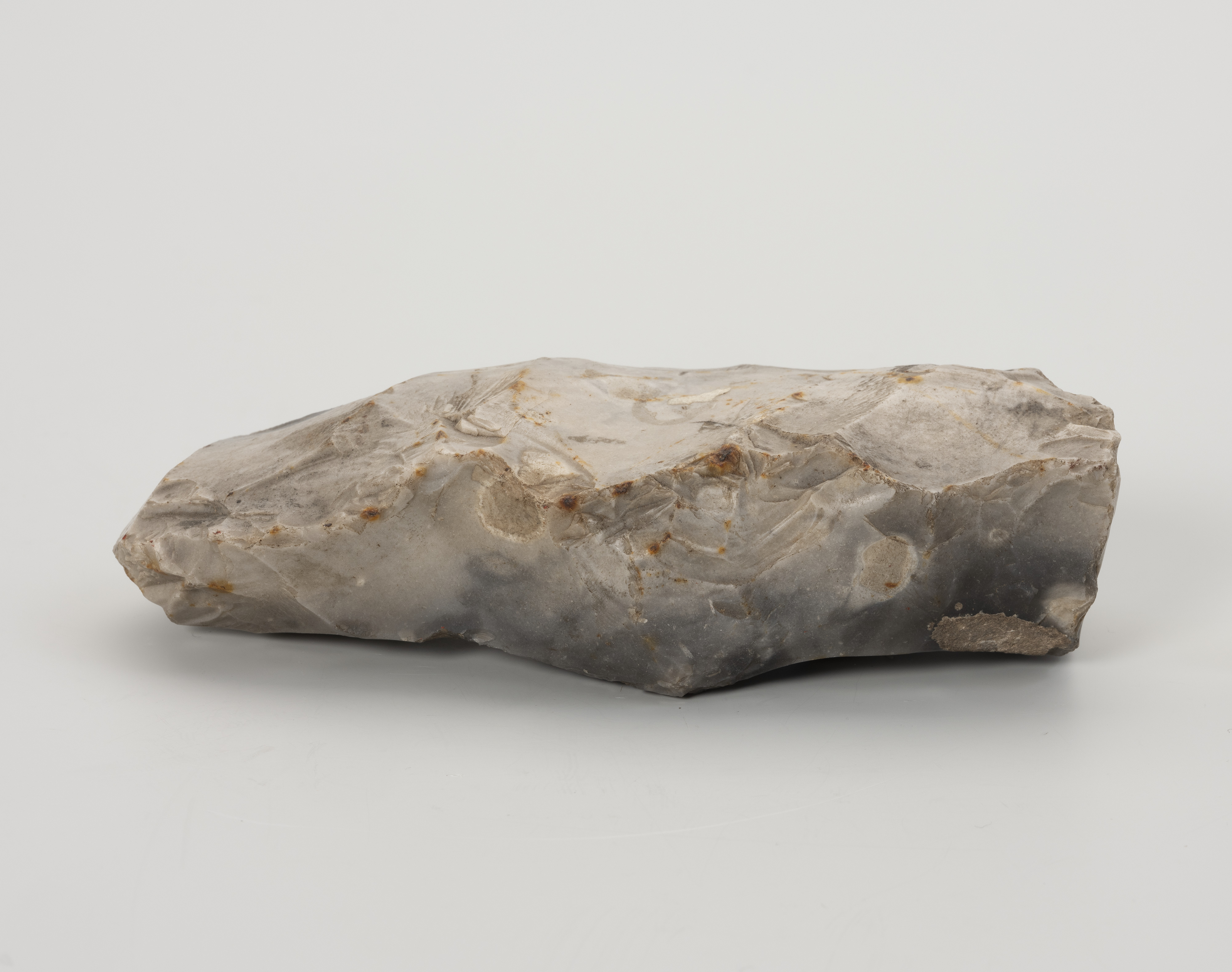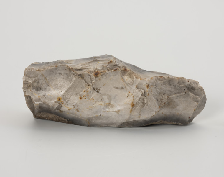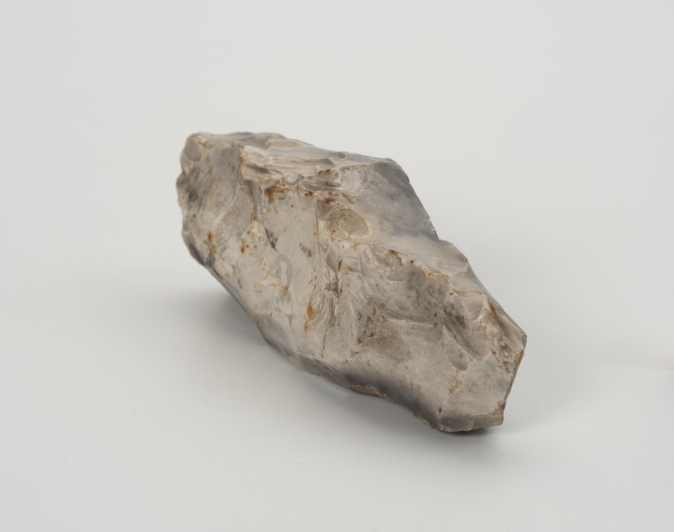 The precise context in which the presented chopper from Police was discovered remains unknown. Its original inventory number from the Gesellschaft für Pommersche Geschichte und Altertumskunde (1824–1945) suggests that it was donated to the Society in the second or third decade of the 20th century. The entire collection was later transferred to the Provinzialmuseum Pommerscher Altertümer, opened in 1927 and operating under the name Pommersches Landesmuseum in Stettin from 1934 to 1945. The chopper was made from a high-quality nodule of locally occurring Cretaceous flint. It takes the form of an elongated wedge with a quadrangular cross-section. The tool was shaped from a small core using a hard hammerstone. However, the butt end was left as a natural, unmodified surface. The entire surface of the chopper shows significant wear in the form of crushing, polishing and flaking, most likely caused by heavy use – probably digging. This suggests that it served as the head of a pick or hoe. Choppers are tools designed for heavy-duty tasks, typically used as heads for composite implements consisting of shafts, bindings and working parts made from stone, flint, bone, antler and wood. They were used to process both hard materials, such as wood, antler or bone, and soft ones like skin and meat. They were also used for digging or breaking through ice. Such tools were a typical element of the toolkit of Mesolithic hunter-gatherer communities living in the forests of Western Pomerania during the early and middle Holocene (c. 9600–4100 BC). Michał Adamczyk