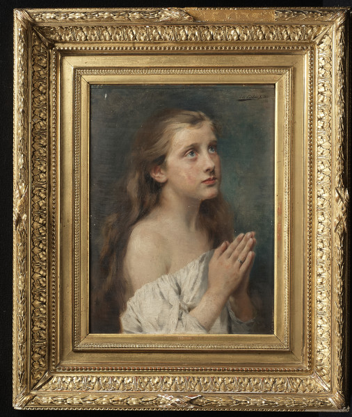 The rectangular painting depicts a praying girl. She has an oval face with large dark eyes, a long straight nose and carmine lips. Her long light brown hair is brushed away from her forehead, falling down to cover her back. She has an exposed neck and right shoulder. A ring can be seen on the right-hand finger. The bluish portrait background of is plain. The painting has a wide wooden profiled gilt frame, decorated with ornamental strips. The strip closest to the edge of the canvas features a geometric ornament, followed by a strip of pearl ornament, then a highly stylised cymatium and an outer strip decorated with a ribbon motif. Signed in upper right corner in black paint: Ewa Liphardt 1881. The easel painting called the “Praying Girl” is oil on canvas. It was acquired from the Potocki family in 1944.
