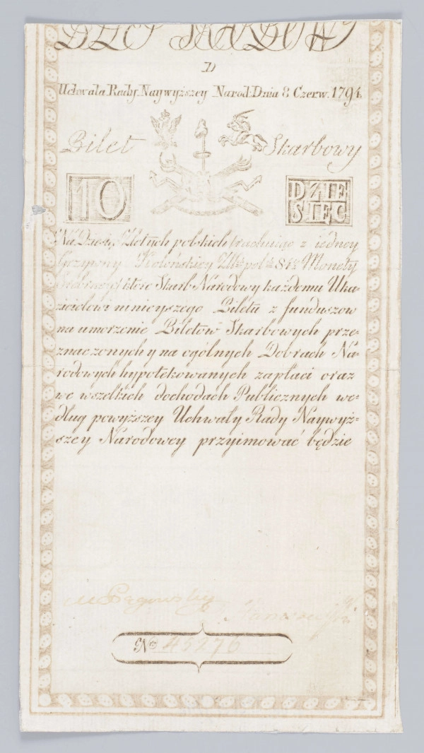 Tadeusz Kościuszko's search for the means needed to finance military operations during the Kościuszko Uprising prompted him to resort to a solution that has been theoretically considered in Poland since the 1870s. This measure was the introduction of paper money into circulation. On the orders of the uprising's leader, his executive body – the Supreme National Council – appointed the Directorate of Treasury Bills on 8 June 1794. The institution was in charge of preparing the issue of the new means of payment. Many technical issues had to be considered, including finding a supplier of appropriate paper, designing a layout, creating security features to make counterfeiting difficult, and so on. People were also needed to deal with the various issues. It is worth remembering that money, apart from its basic role, has almost always had symbolic and propagandistic functions. It was no different with the insurrectionary treasury tickets introduced into circulation on 16 August 1794. All the denominations issued at that time, i.e., 5, 10, 25, 50, 100, 500 and 1000 zlotys, had a common graphic design, in which revolutionary symbols, referring to the French Revolution, came to the fore. These were: the Phrygian cap, the armament of the sans-culottes, the towers of prison walls, the chains of absolutism, the thunders of the people and the wings of liberty. The national symbols of the Eagle and the Pogoń were treated in a somewhat marginal way.