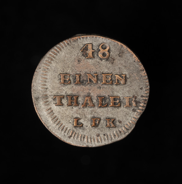 After Sweden entered the Seven Years’ War (1757–1762), it urgently needed funds to pay its army. In 1758, King Adolf Frederick (1710–1771) authorised the lease of the royal mint in Stralsund and the production of debased coinage. The mint was taken over by bankers who withdrew older coins from circulation and re-struck them with progressively lower silver content. Circulating coins, such as 1/3, 1/6, 1/12, 1/24, and 1/48 thalers, were minted with varying silver purity and specially marked. The entire operation was kept secret, and as production increased, so did the workforce. By 1759, the mint employed 65 workers and used 12 horses. Unemployed labourers and craftsmen from unrelated trades, such as weavers, stocking makers, and fishermen, were trained for minting. In 1760, the mint was placed back under direct royal administration, but the quality of its coins deteriorated further. Enormous amounts of low-value small denominations flooded the market. Billon schillings were struck for two years (1760–1761) using a minting standard that had reached 41¼ thalers per mark of silver. These debased coins, similar to the inflationary schillings circulating in Prussia and Mecklenburg, contributed to the disruption of the monetary system. In 1761, the coin dies began featuring the initials of four mintmasters. Only a select few knew the secret behind the markings, which was only exposed after the war when the depreciated currency was exchanged. The variety and inconsistency of these marks suggest deliberate deception, especially since some small denominations were never redeemed. In the case of schillings, dots were used as indicators, placed either near the mintmasters’ initials or the date. Coins without these dots contained slightly more silver and were exchanged at a better rate. The coin on display fully illustrates the collapse of the silver standard. It is made from such poor-quality metal that it appears to be copper coated with a thin layer of silver. Genowefa Horoszko