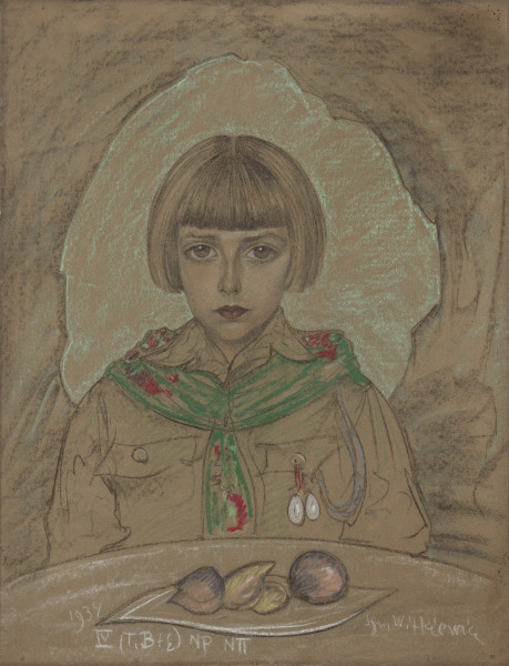 This portrait of a child, with a bowl haircut, a scout uniform with a functional cord, and a highland-style scarf draped over the shoulders, was created in April 1934, likely during Witkacy’s financially successful but exhausting stay in Nowy Sącz. It belongs to category B+E, reserved specifically for children. The accompanying signature codes indicate that the artist abstained from nicotine (NP) and alcohol (Nπ) during the session. Witkacy also had a habit of incorporating symbolic props – usually either fruit or a book – to express his opinion on the intellect of his often unwilling young sitters.