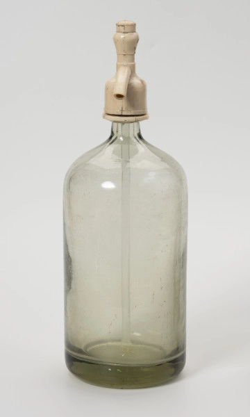 A siphon is a thick-walled bottle for carbonated drinks – most commonly water saturated with carbon dioxide, also known as soda water. It was invented in France in the 1820s, and a version similar to the modern one was invented in 1837 by Antoine Perpigua. The characteristic feature of a siphon is a closing mechanism, which, when opened, uses the pressure of the gas inside to push the liquid out, while maintaining the level of carbonation in the remaining water. Once emptied, the siphon required refilling, which was done at specialised points by trained personnel. Soda water in exchangeable glass siphons, such as the object described here, was extremely popular from the 1950s to the 1970s. In the following decade, metal siphons with replaceable cartridges appeared, which – although not as widely used – are still in use today. Iwona Karwowska
