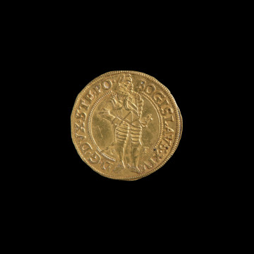 The reign of Duke Bogislaw XIV fell entirely during the Thirty Years' War (1618-1648). The contributions and maintenance of the imperial army, which occupied the Duchy territory in 1627, consumed huge sums. After the period of mass issues of low-value double shillings, the ducal mints in Szczecin and Koszalin produced only thalers, their fractions and ducats. They did not serve to improve the finances of the Duchy but satisfy the foreign armies' claims. Despite the critical political and economic situation, no changes were made to the state's minting system. In 1633, both mints made ducats with very similar graphic designs. For the first time, the main side featured the image of the Duke standing in armour, with a rapier by his side. Bogislaw XIV was presented in a representative pose as an ideal knight and ruler. It is worth noticing that military accents are visible, despite the tragic situation of the country, the Duke's illness and partial paralysis. The obverse of the coin refers to the Dutch model of ducats, which became popular in Europe in the 17th and 18th centuries. On the reverse, there are multi-field shields with symbols of the lands constituting the Pomeranian Duchy. It is where the iconographic similarity between Koszalin and Szczecin ducats ends. The Szczecin specimens are distinguished by the decorative finial of the coat of arms, emphasising the traditional heraldic symbol of the Pomeranian state and dynasty. The text in the reverse legend informs that this is a new gold coin with the current stamp and exchange rate, which was significant as lighter guilders were in circulation. The presented coin is not representative; the ruler's image is very schematic and not very neat, which is surprising, as skilled engravers were usually employed to issue gold coins. It seems that in this case, it was not aesthetic but economic reasons that were decisive. The issues were intended for the pay of high-ranking officers of the imperial army.