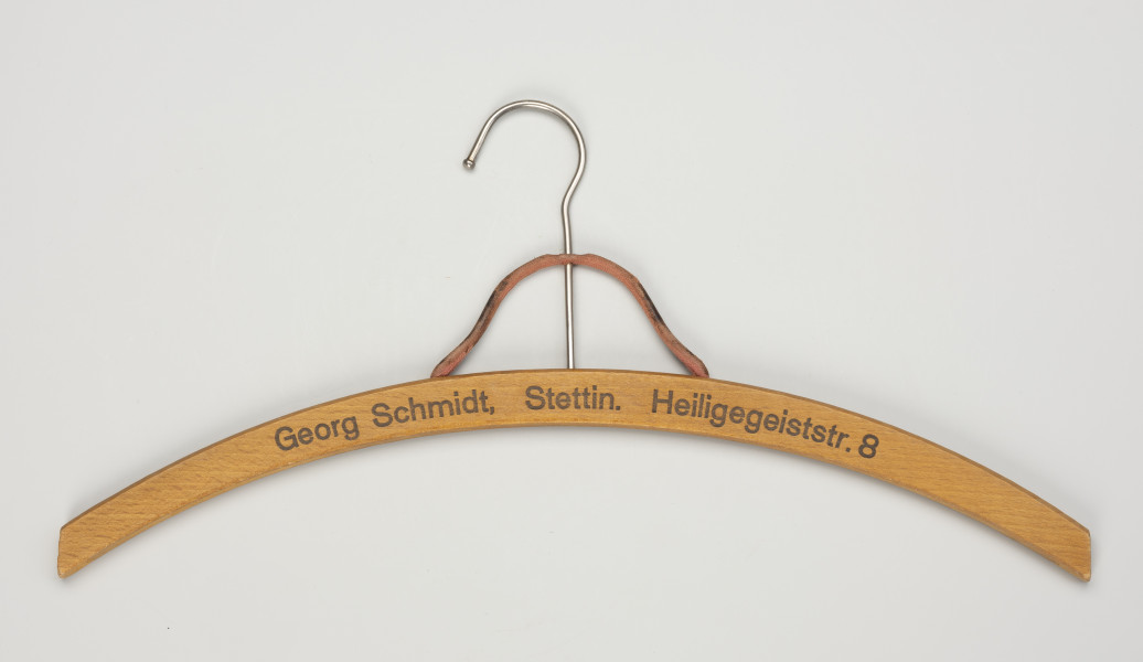 Before World War II, the streets of Szczecin’s Old Town were home to numerous service establishments, clothing shops, and department stores. At the turn of the 19th and 20th centuries, two department stores were built at Heiligegeststraße 7 and 8, one of which, known to Szczecin residents as Stara Drukarnia (Old Printing House), has survived to this day. Between 1900 and 1901, a grand Neo-Baroque building with Art Nouveau elements was constructed at Heiligegeiststraße 7a and 7b. Number 7a became the headquarters of the company H.B. Juda, which had been in operation since at least the late 1850s, specialising in men’s ready-to-wear clothing, including for export. The first and second floors of the building housed storage facilities, while the top floor was occupied by the editorial office of the popular newspaper Stettiner Abendpost. On the ground floor of 7b, there was Robert Dietz’s restaurant and Schlomski’s tobacco shop. Most premises changed tenants and purposes over time – only the Hotel Metropole operated continuously at 7b from 1901 to 1945. In 1899, a commercial building was completed at Heiligegeststraße 8 for Leopold Juda’s department store. By the 1930s, several clothing manufacturers and retailers operated at this address: men’s clothing firms Stein & Levy and Lehmann & Co., and the women’s fashion store Klein Geschw. (Klein Siblings). In 1928, Georg Schmidt’s clothing workshop opened at the same address. According to Szczecin address books, Schmidt had operated his business since 1922 at a neighbouring building, number 7a. Proof of his business activity is also provided by a wooden clothes hanger from the collection of the National Museum in Szczecin. The hanger features Schmidt’s name and address at number 8 printed in black lettering. Hangers like this, used as promotional tools, often included the company’s address along with additional location details and information about its products. Małgorzata Peszko