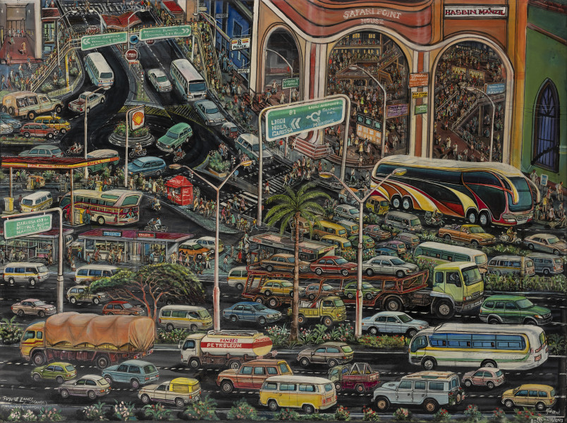 Richard Onyango (1968– ), born in Kisii, Kenya, is a visual artist who primarily works in painting but also creates sculptural models. He writes, tells stories from his life, and composes music. He is self-taught. Before becoming a recognised artist, he worked in an extraordinary range of professions – as a sign painter, bus driver, carpenter, fashion designer, musician, furniture maker and farmer. Two paintings by Richard Onyango in the collection of the National Museum in Szczecin, titled *Lamu of the Future*, present a utopian vision of the town of Lamu, which was added to the UNESCO World Heritage list in 2001. Located on an island of the same name in south-eastern Kenya, Lamu is one of the oldest and relatively best-preserved settlements representing Swahili culture. This culture emerged from the blending of African, Arab, Persian, Indian and European influences. Lamu is known for its unique coral-stone architecture, narrow alleyways, richly decorated doors and ornamental stucco. As there are no motor vehicles on the island, transport and other heavy work is carried out using donkeys. In his visionary paintings, Onyango has modernised Lamu, showing it with airports, ports, shopping centres and crowds of people. He has transformed the small coastal town into a contemporary metropolis. Onyango’s work has been exhibited at the Venice Biennale (2003) and at many key exhibitions shaping global reception of contemporary African art, including *When We See Us: A Century of Black Figuration in Painting* at Kunstmuseum Basel and Zeitz MOCAA in Cape Town (2023–2024), *100% Africa* at the Guggenheim Museum in Bilbao (2006), *African Art Now* at the Museum of Fine Arts in Houston (2005), and *Africa Remix* at Hayward Gallery in London, Mori Art Museum in Tokyo, Centre Georges Pompidou in Paris and Kunstpalast in Düsseldorf (2004–2006). His solo shows have been held at MAMCO in Geneva, Salvatore Ala Gallery in New York City, and Fabbrica Eos in Milan. Many of his works are held in the prestigious Contemporary African Art Collection (CAAC) in Geneva, founded by Jean Pigozzi. Richard Onyango also collects rare vintage cars, which he modifies, and he plans to turn this collection along with his art into a future museum in Malindi. Marlena Chybowska-Butler